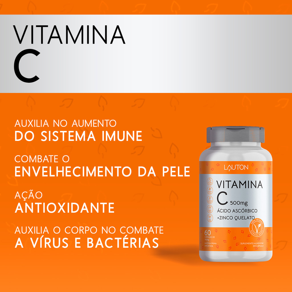 A Vitamina C é essencial para várias funções do organismo, como a produção de colágeno e a absorção de ferro, além de contribuir para o bom funcionamento do sistema imune. Porém, muitas vezes, não conseguimos obter a quantidade ideal dessa vitamina apenas pela alimentação, sendo necessário recorrer à suplementação. A Lauton Nutrition desenvolveu um suplemento com 500 mg de Vitamina C por cápsula, enriquecido com Zinco Quelato para potencializar seus benefícios. Com formulação vegana, livre de glúten, lactose e açúcares, este suplemento é ideal para o uso diário, promovendo uma nutrição prática e eficiente. INFORMAÇÕES DE DESTAQUE 500mg de Vitamina C Ácido Ascórbico Zinco Quelato Livre de crueldade em animais Zero glúten Zero lactose Zero açúcar 100% vegano INGREDIENTES Ácido Ascórbico (Vitamina C), Amido, Zinco quelato bisglicinato, antiumectantes estearato de magnésio e dióxido de silício. Cápsula vegetal: Hipromelose e opacificante INS171. NÃO CONTÉM GLÚTEN. SUGESTÃO DE USO Tomar 1 cápsula ao dia com água ou conforme recomendação profissional.