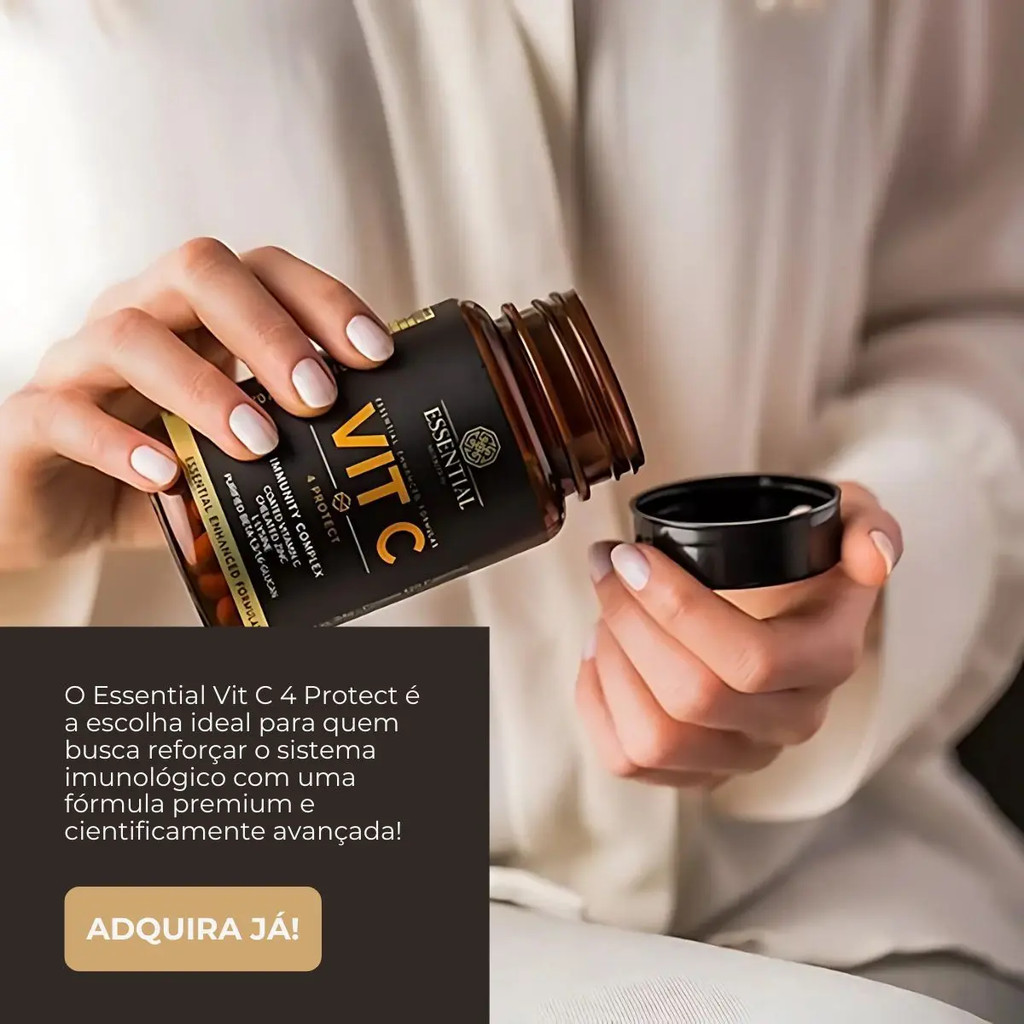 INFORMAÇÕES DE DESTAQUE Suplemento alimentar em cápsulas; 500mg de Vitamina C revestida; 10mg de Zinco Quelato; 125mg de Betaglucana de levedura; 400mg de Aminoácido L-lisina; Não contém glúten. DESCRIÇÃO A Vitamina C de um jeito que você nunca viu! VIT C 4 Protect Essential é uma fórmula que combina ingredientes poderosos para cuidar de você e da sua família diariamente. Suas cápsulas contêm vitamina C + zinco quelado + betaglucana de levedura + aminoácido L-lisina e oferecem doses efetivas com elevado poder de absorção. A linha Essential Enhanced Formulas compreende o funcionamento do organismo, a sinergia entre os ingredientes e as propriedades nutricionais que podem ser conquistadas através da combinação inteligente dos nutrientes. COMPOSIÇÃO Ácido ascórbico revestido (vitamina C), cloridrato de L-lisina, betaglucana de levedura (Saccharomyces cerevisiae), bisglicinato de zinco, estabilizante celulose microcristalina e antiumectante dióxido de silício. Composição da cápsula: gelatina, água purificada e corante inorgânico dióxido de titânio. NÃO CONTÉM GLÚTEN. SUGESTÃO DE USO Ingerir 3 cápsulas ao dia ou conforme prescrição de médico ou nutricionista. Este produto é recomendado para adultos a partir de 19 anos.