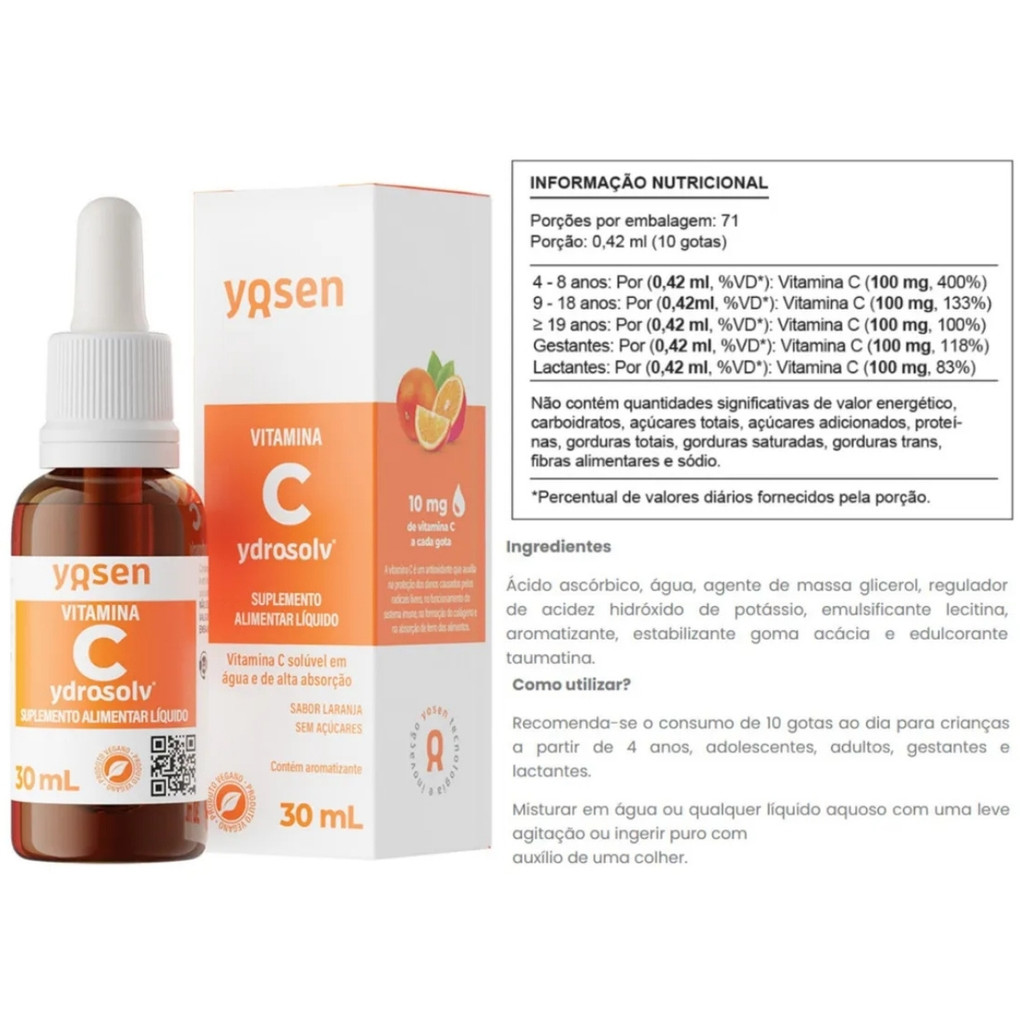Sobre o produto: A Vitamina C Ydrosolv® é um suplemento líquido desenvolvido com tecnologia avançada que oferece alta biodisponibilidade e absorção eficiente. A vitamina C, também conhecida como ácido ascórbico, é um nutriente essencial com potente ação antioxidante, fundamental para diversas funções biológicas. Sua atuação é especialmente importante na proteção contra os radicais livres, no suporte ao sistema imunológico e na síntese de colágeno, essencial para a saúde da pele, vasos sanguíneos e articulações. A formulação líquida da Yosen é prática e versátil, permitindo fácil administração e ajuste da dose de acordo com a necessidade. Como consumir - Utilize conforme a orientação de um profissional de saúde. - A fórmula líquida permite personalizar a dose e pode ser ingerida diretamente na boca ou diluída em água ou sucos naturais. - Ideal para uso diário em qualquer momento do dia. Benefícios - Potente ação antioxidante - Auxilia no funcionamento do sistema imune - Contribui para a formação do colágeno - Atua no metabolismo energético, de proteínas e gorduras - Pode ajudar na proteção contra os danos dos radicais livres - Alta absorção e biodisponibilidade - Praticidade de uso com dose ajustável - Fórmula líquida e segura para o consumo diário Alergênicos: Consultar a embalagem para informações completas. Não contém glúten. Ingredientes: Composição completa não fornecida no conteúdo original. Recomenda-se verificar a embalagem do produto para a lista completa de ingredientes. Advertências - Este produto não é um medicamento. - Não exceder a recomendação diária de consumo indicada na embalagem. - Mantenha fora do alcance de crianças. - Gestantes, lactantes e pessoas com condições médicas devem consultar um profissional de saúde antes de iniciar o uso. - Armazenar em local fresco, seco e protegido da luz. Conclusão: A Vitamina C Ydrosolv® 30 ml da Yosen é uma solução prática e eficaz para quem busca fortalecer o sistema imunológico, combater os radicais livres e promover a síntese de colágeno. Com formulação líquida e alta absorção, é ideal para o uso diário e se adapta facilmente à rotina de cuidados com a saúde.