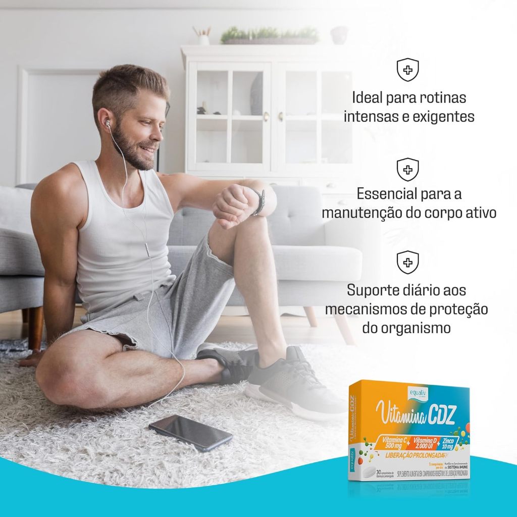 Vitamina CDZ Equaliv Tripla Ação Com 30 Comprimidos de Liberação Prolongada Principais Características: • Combinação de vitaminas C, D e Zinco, que atuam de forma complementar no fortalecimento do organismo. • Tecnologia de liberação prolongada, garantindo absorção gradual e contínua dos nutrientes ao longo do dia. • Fórmula prática em comprimidos, desenvolvida para o consumo diário. Benefícios: • Auxilia no fortalecimento do sistema imunológico. • Contribui para a manutenção da saúde óssea e muscular. • Possui ação antioxidante que ajuda a combater os radicais livres. • Suporta a recuperação e disposição no dia a dia. Diferenciais do Produto: • Tripla ação em uma única fórmula, oferecendo praticidade e eficácia. • Tecnologia de liberação prolongada, que otimiza a absorção e aproveitamento dos nutrientes. • Desenvolvido pela Equaliv, marca referência em suplementos de alta qualidade. Especificações Técnicas: • Peso: 30 comprimidos Instruções de Uso: • Ingerir 1 comprimido ao dia ou conforme orientação de médico ou nutricionista. Avisos e Precauções: • Este produto não é um medicamento. • Não exceder a recomendação diária de consumo indicada na embalagem. • Gestantes, lactantes e crianças somente devem consumir sob orientação médica. • Manter em local fresco, seco e ao abrigo da luz. • Mantenha fora do alcance de crianças. O que está incluso? • 1 Vitamina CDZ Equaliv Tripla Ação Com 30 Comprimidos de Liberação Prolongada ---- DÚVIDAS FREQUENTES ---- Os produtos são originais? Sim. Todos os nossos produtos são originais. Emitem nota fiscal? Sim. Emitimos nota fiscal para todos os pedidos.
