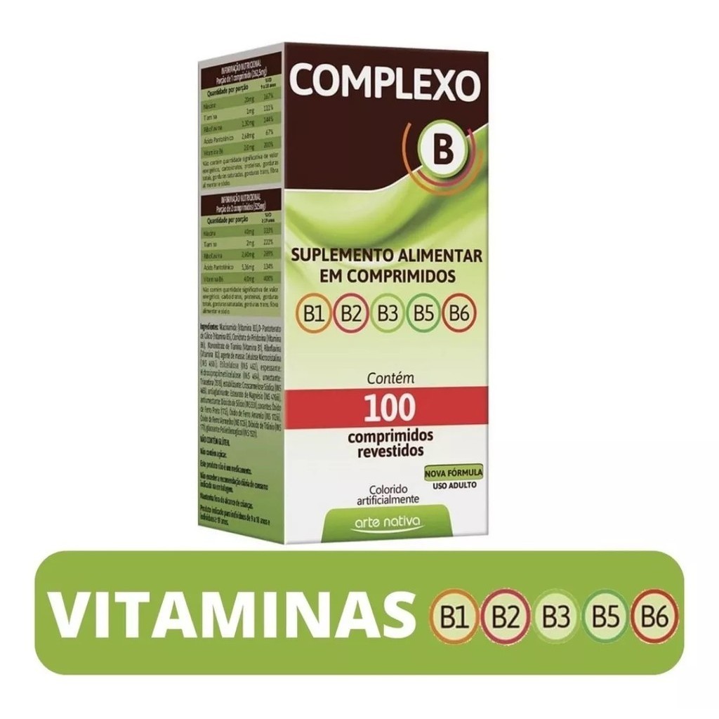 Vitamina Complexo B 100 Comprimidos - Arte Nativa Vitaminas B1, B2, B3, B5 e B6 Pra que serve: é um suplemento polivitamínico que oferece em apenas uma dose 100% da ingestão diária recomendada destas vitaminas do complexo B, que atuam como auxiliar do metabolismo celular, na manutenção da saúde do sistema imunológico, na gestação e anemias. As vitaminas do complexo B desempenham diversas funções no organismo: ajudam na concentração e memória, melhoram a saúde da pele, unhas e cabelos e auxiliam no metabolismo de açúcares, proteínas e gorduras. As vitaminas do complexo B são um grupo de oito vitaminas: tiamina (B1), riboflavina (B2), niacina (B3), ácido pantotênico (B5), piridoxina (B6). Estas vitaminas são essenciais para a decomposição química de carboidratos em glicose, fornecendo energia para o organismo; para a decomposição química das gorduras e proteínas, ajudando no funcionamento normal do sistema nervoso; e para o tônus muscular no estômago e no trato intestinal; além de serem benéficas para a pele, cabelos, olhos, boca e fígado. Imagens Meramente Ilustrativas. Todas as Informações Divulgadas são de Responsabilidade Exclusiva do Fabricante/fornecedor.