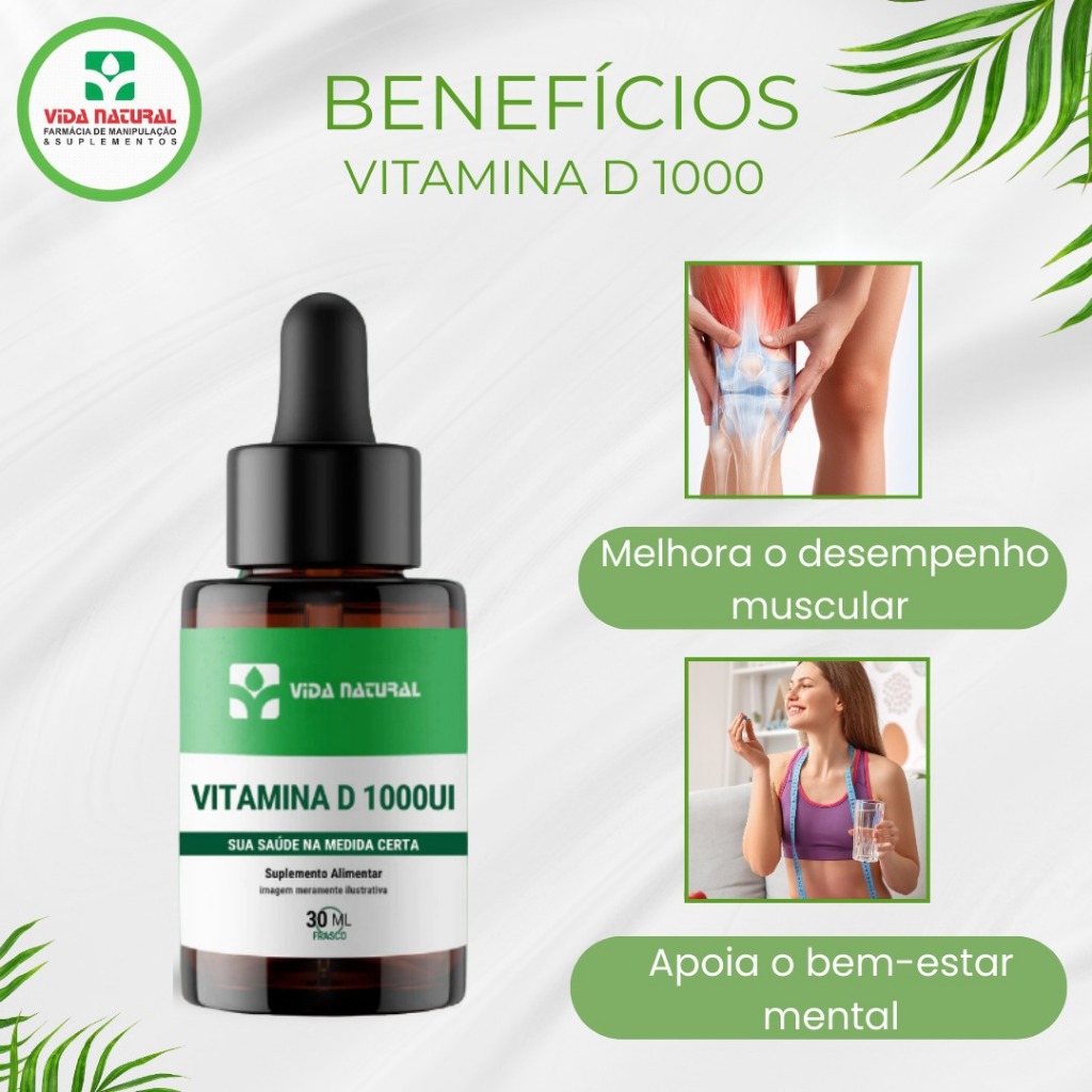 A vitamina D é constantemente associada ao controle do cálcio nos ossos, bem como no metabolismo do mesmo no organismo. Ajuda contra a fraqueza muscular além de proteger o corpo de outras deficiências e doenças. Também está envolvida em várias funções do sistema imunológico, digestivo, circulatório e nervoso; promovendo assim o fortalecimento destes. Sugestão de uso: Tomar 1 gota ao dia (1000UI) . Cada gota equivale a 1000UI de Vitamina D. Tome de preferência junto à principal refeição do dia. COMPONENTES: VIT D3, ÓLEO DE GIRASSOL , SEM ADIÇÃO DE CORANTES Validade: 6 meses Idade mínima recomendada: 18 anos. Obs: Não contém glúten, lactose Este produto é um suplemento dietético. Suplementa dietas insuficientes. Consulte o seu médico e/ou farmacêutico. Precauções: Manter longe do alcance de crianças. Conservar ao abrigo da luz, calor e umidade. Advertências: Imagem Meramente Ilustrativa Pessoas com hipersensibilidade à substância não devem ingerir o produto. Em caso de hipersensibilidade ao produto, recomenda-se descontinuar o uso e consultar o médico. Este produto não deve ser utilizado por gestantes e lactantes sem orientação médica. Este produto não deve ser utilizado por menores de 18 anos sem orientação médica. Não use o produto com o prazo de validade vencido. Manter em temperatura ambiente (15 a 30ºC). Proteger da luz, do calor e da umidade. Nestas condições, o produto se manterá próprio para o consumo, respeitando o prazo de validade indicado na embalagem. Siga corretamente o modo de usar. Não desaparecendo os sintomas, procure orientação médica. Nunca compre suplementos sem orientação de um profissional habilitado. "Os resultados e indicações referentes ao uso desse produto foram avaliados e comprovados pelo fabricante deste insumo farmacêutico. Não garantimos os resultados descritos, estes variam de pessoa para pessoa dependendo de diversos fatores como alimentação, prática de exercícios físicos, presença de outras patologias, bem como, o uso correto do produto conforme descrito na posologia.”