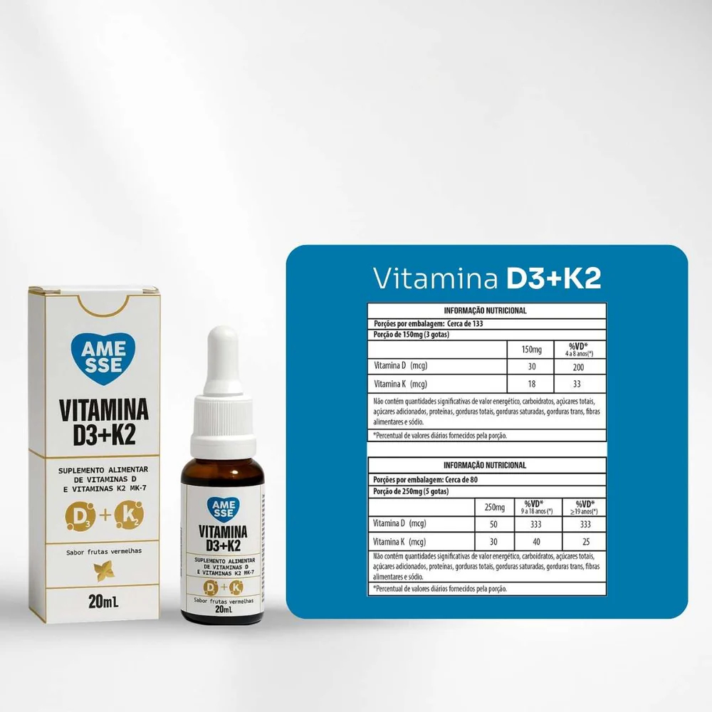 Vitamina D3+K2 Complexo Ósseo - Fórmula Avançada Amesse 20ml Você mora em área urbana? Sabia que cerca de 80% das pessoas que vivem nesse ambiente são carentes em vitamina D? Pensando nisso, criamos a Vitamina D3, um suplemento que combina os benefícios da vitamina D com os da vitamina K. Além da vitamina D, este suplemento contém vitamina K, que tem como principal função ajudar na coagulação sanguínea. Essencial na produção de proteínas de coagulação, como a protrombina, a vitamina K adequada é crucial para garantir que a coagulação sanguínea ocorra de forma adequada, prevenindo hemorragias. Auxilia na absorção adequada de cálcio e fósforo. Importante para a saúde dos ossos e dentes. Contribui para o funcionamento do sistema imunológico. Ajuda a reduzir o acúmulo de cálcio nas artérias.