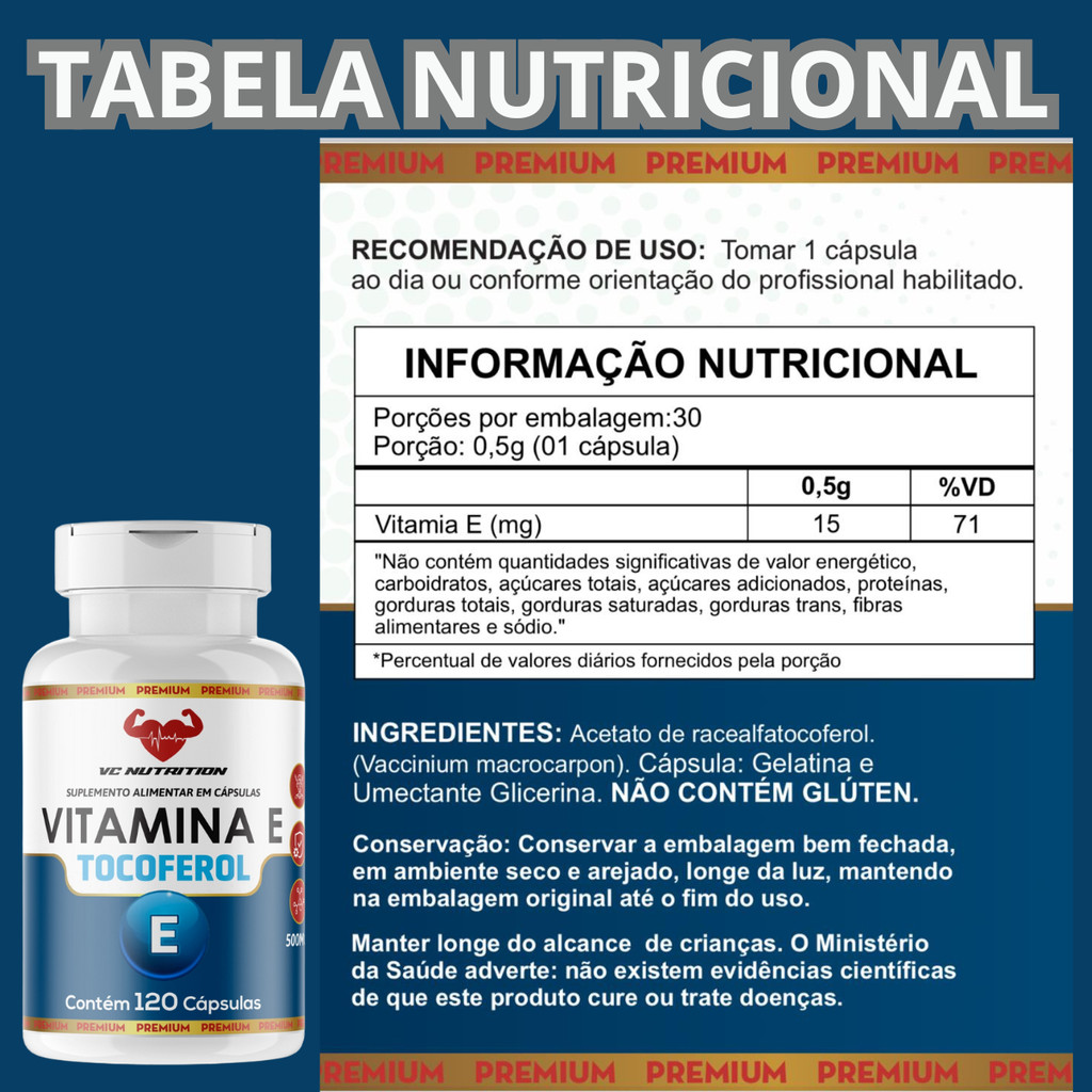 Vitamina E 120 Cáps 500mg – Original - Suporte e Equilíbrio Diário A Vitamina E 120 cápsulas 500mg é um suplemento desenvolvido para complementar a rotina alimentar de forma prática. Esse nutriente está presente em diversas fontes naturais e é amplamente utilizado no dia a dia. Com fórmula de qualidade e fácil consumo, pode ser uma excelente opção para quem busca um suporte diário. Ideal para incluir na alimentação, auxilia no equilíbrio e bem-estar. Produzido com ingredientes selecionados, é uma alternativa conveniente para um estilo de vida equilibrado. Seu formato em cápsulas facilita a ingestão, tornando-o uma escolha prática para complementar a rotina Atenção: Esse produto é um suplemento alimentar