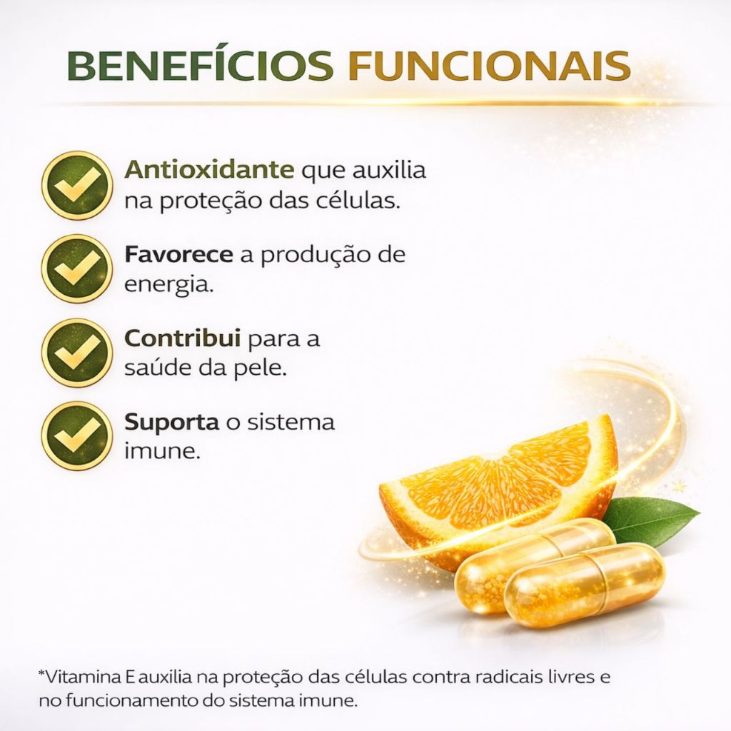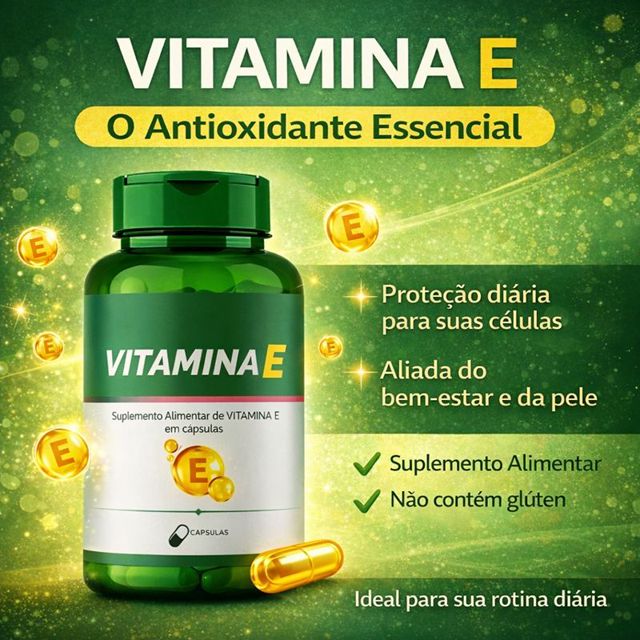 ✨ Vitamina E – Proteção e cuidado diário A Vitamina E é um suplemento alimentar que auxilia na proteção das células contra os danos causados pelos radicais livres. Ideal para complementar a ingestão desse nutriente essencial no dia a dia. 🔥 O que tem na fórmula ✔ Vitamina E (D-alfa-tocoferol) ✔ Cápsulas práticas para uso diário ✅ Benefício aprovado (Anvisa) ✔ A Vitamina E auxilia na proteção dos danos causados pelos radicais livres ⭐ Diferenciais que vendem ✔ 100% do valor diário por dose ✔ Fórmula simples e eficiente ✔ Fácil consumo (1 cápsula ao dia) ✔ Sem glúten ✔ Ideal para rotina diária 📊 Informação nutricional Porção: 1 cápsula Vitamina E: 15 mg (100% VD) 🕐 Como usar Consumir 1 cápsula ao dia Indicado para adultos (≥ 19 anos) 🧾 Ingredientes Acetato D-alfa-tocoferol (Vitamina E) e amido. Cápsula: gelatina e glicerina. Não contém glúten ⚠️ Advertências Este produto não é um medicamento Este produto é um suplemento alimentar Não exceder a recomendação diária Manter fora do alcance de crianças