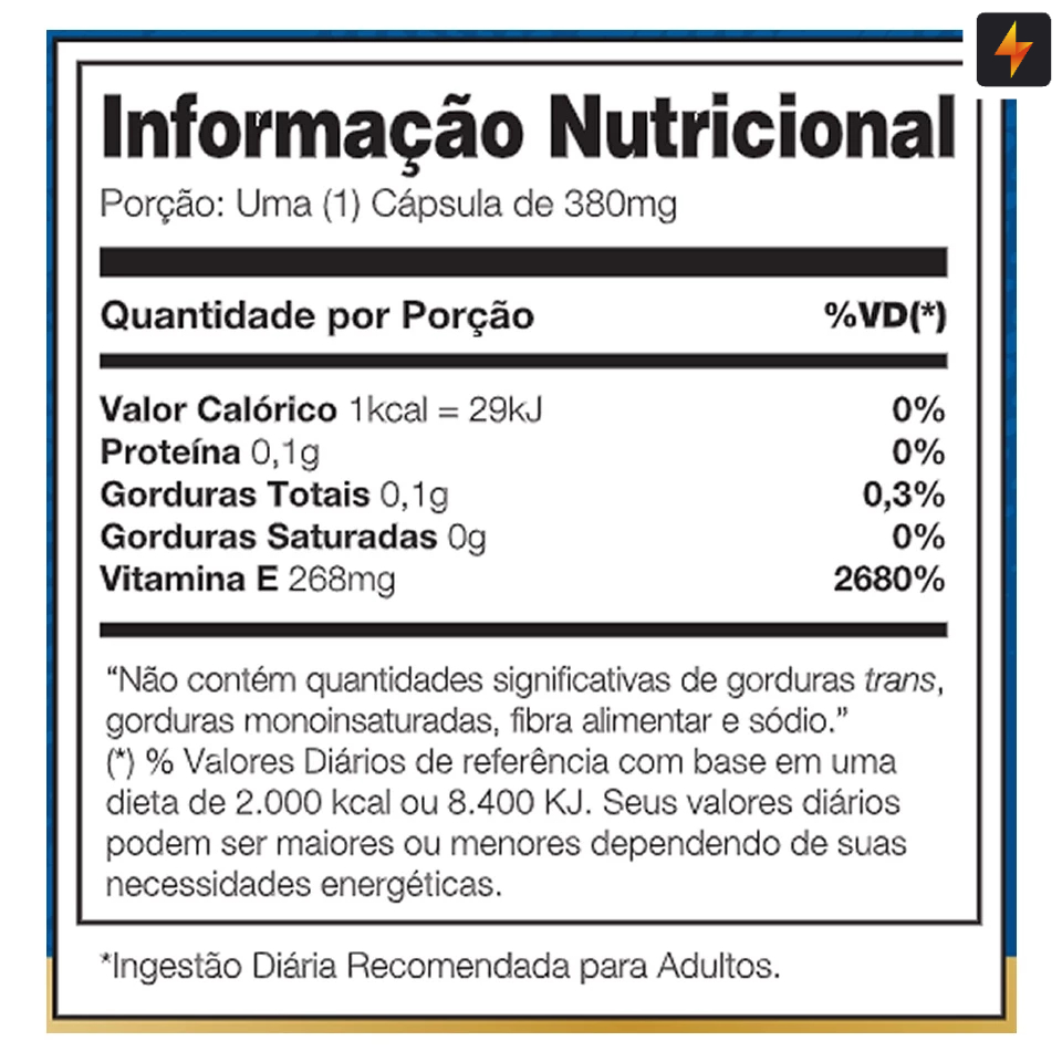 Bem vindo a DaFábricaSuplementos. -Loja Oficial Shopee -Compra 100% assegurada e garantida. -Todos nossos produtos são 100% originais, lacrados, dentro da validade e acompanhados de Nota Fiscal. -Despachamos em 24 horas úteis (pedidos são coletados pela transportadora Shopee Express as 8:00 da manhã). -Qualquer dúvida, estamos sempre disponíveis para te atender no chat. ------------------------------------------------------------------------------------------------------------------------------------------------------------------------------------------------- A vitamina E é um dos principais antioxidantes para nosso organismo, atuando no combate do envelhecimento precoce e prevenindo a ação dos radicais livres que afetam o corpo humano. É uma vitamina lipossolúvel, ou seja, sua absorção é potencializada no organismo quando consumida junto de alimentos que são fonte de gorduras boas (ex.: azeite, castanhas, pasta de amendoim, gema do ovo etc.). Ainda que sua suplementação não tenha se popularizado tanto como a vitamina C e D, seus benefícios para a saúde do corpo humano são tão indispensáveis quanto, uma vez que atua promovendo melhora no sistema imunológico e na prevenção de doenças neurológicas e cardiovasculares. Benefícios da Vitamina E BTX ◘ Promove auxílio no fortalecimento do sistema imunológico; ◘ É um dos melhores antioxidantes disponíveis, atuando com eficácia no combate de radicais livres; ◘ Previne o envelhecimento precoce; ◘ Atua na manutenção da saúde cardíaca e cerebral (por isso muito comum sua presença em suplementos de Ômega 3); ◘ Concentração ideal por cápsula (380mg), de forma que se ajusta as necessidades da maioria dos indivíduos. Perguntas e Respostas 1. Existe alguma contraindicação do uso da Vitamina E BTX? R: Não! Com base na indicação de uso (1 cápsula – 380mg - por dia), a Vitamina E BTX fornece dose diárias que não oferecem risco de superdosagem. 2. Como fazer uso da Vitamina E BTX? R: A absorção da vitamina E pelo organismo é beneficiada quando sua ingestão acompanha alimentos que são fontes de gordura boa, sendo uma ótima oportunidade de uso do suplemento as ocasiões em que haverá consumo desses alimentos em determinada refeição. Modo de uso Adultos > 19 anos ingerir 1 cápsula, ao dia preferencialmente antes das principais refeições ou conforme orientação de nutricionista e/ou médico. Ingredientes Vitamina E (Acetato DL-alfa-tocoferol), óleo de soja. Composição da cápsula: (gelatina, água e glicerina). NÃO CONTÉM GLÚTEN. NÃO CONTÉM LACTOSE. ALÉRGICOS: CONTÉM SOJA. __________________________________________________________________________________________________________________________ ==== PRODUTO ORIGINAL – VERIFIQUE DIRETAMENTE NA FÁBRICA ATRAVES DO LOTE E VALIDADE ==== ENTREGAS TERCEIRIZADAS, VERIFIQUE O PRAZO DE ENTREGA ==== NÃO ACEITAMOS DEVOLUÇÕES DE PRODUTOS ABERTOS E CONSUMIDOS