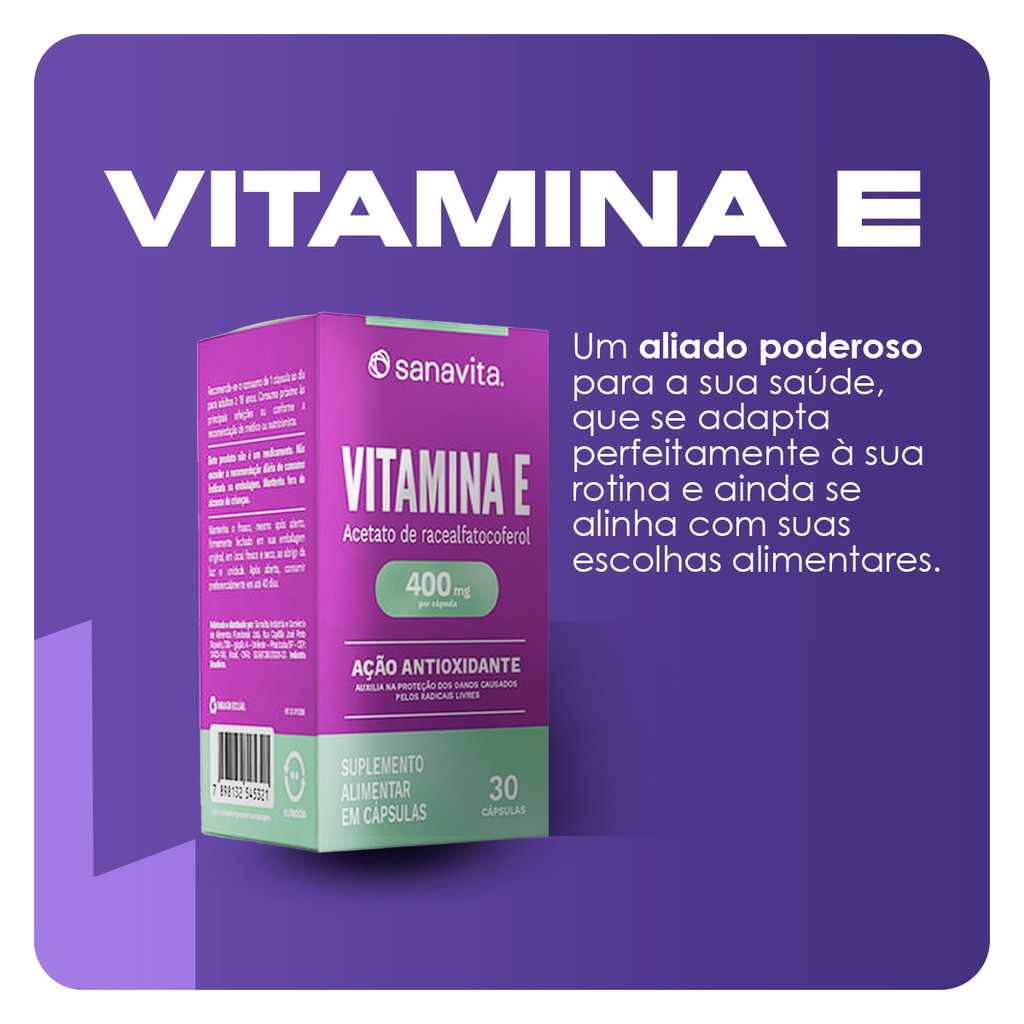 INFORMAÇÕES DE DESTAQUE: • Vitamina E na forma de acetato de racealfatocoferol. • 1 cápsula contém 400 mg de vitamina E. • Atende a 2667% das necessidades diárias dessa vitamina. • Formato prático – cápsula softgel. • Zero calorias. • Zero açúcares. • Zero lactose. • Não contém glúten. • Cápsulas sem corantes. COMPOSIÇÃO Acetato de racealfatocoferol (vitamina E) e óleo de girassol. Cápsula: água purificada, gelificante gelatina e umectante glicerol. ALÉRGICOS: PODE CONTER LEITE, SOJA E PEIXE. NÃO CONTÉM GLÚTEN. SUGESTÃO DE USO: Recomendamos o consumo de 1 cápsula ao dia. Consumir próximo às principais refeições, ou conforme a recomendação de médico ou nutricionista.