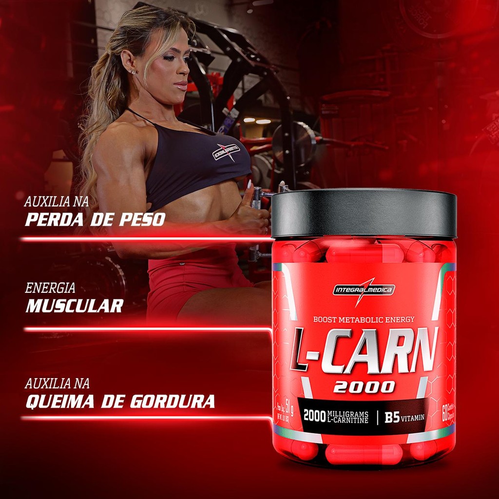 A peça que faltava para você eliminar gordura localizada! L-Carn 2000 da Integralmédica, a L-carnitina é conhecida por gerar energia na célula por meio da queima de gordura, atuando fortemente na perda de peso. Também está relacionada à melhora da performance esportiva e recuperação muscular. A L-carnitina é produzida naturalmente pelo organismo no cérebro, fígado e rins, e também é encontrada em alimentos de origem animal. Muito conhecida por ser utilizada pelo organismo para transporte de ácidos graxos livres de cadeia longa através da membrana mitocondrial. L-Carn Integralmédica também conta com adição de vitamina B5 na sua formulação e é isento de gorduras e carboidratos. Suplemento disponível em pote de 60 ou 120 cápsulas.