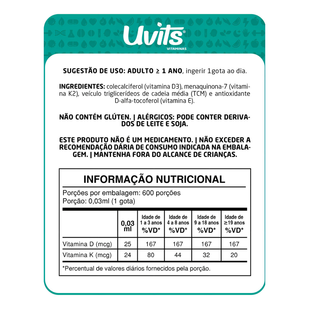 ***PRODUTO NOVO*** ***Com Nota Fiscal*** A nossa Loja traz uma experiência única para os nossos Clientes, priorizando sempre em qualidade de nossos produtos, a excelência no atendimento, a agilidade na entrega e a satisfação de nossos Clientes. Procuramos não apenas atender às suas necessidades, mas superar expectativas. 1 Unidade De Vitamina Kids D3 e K2 Em Gotas 600 Doses 20ml - Uvits A VITAMINA D3 + K2 KIDS GOTAS da Uvits foi pensada exclusivamente para as crianças de 12 meses a 18 anos, ou seja, todas as idades que tenham dificuldade ingerir cápsulas, e também que buscam uma dosagem individualizada e flexível. Fórmula premium e biodisponível que rende aproximadamente 600 doses. É um suplemento nutricional que ajuda o desenvolvimento e o fortalecimento ósseo das crianças, reunindo nutrientes imprescindíveis ao desenvolvimento corporal e fortalecimento ósseo durante a infância e pré-adolescência. Por ser sublingual, tem rápida absorção pelo organismo. Composição: - Colecalciferol (vitamina D3) - Menaquinona-7 (vitamina K2) - Veículo triglicerídeos de cadeia média (TCM) - Antioxidante D-alfa-tocoferol (vitamina E). Em uma gota, você encontra 1000 UIs de vitamina D3 e 24mcg de vitamina K2 (menaquinona). NÃO CONTÉM GLÚTEN. Alérgicos: PODE CONTER LÁTEX NATURAL E DERIVADOS DE LEITE. Sugestão de Consumo: A recomendação diária de vitamina D3 K2 Kids varia de acordo com a idade da criança. 1 a 8 anos – 1 gota ao dia. Acima de 9 anos – 2 gotas. Aviso legal • Idade mínima recomendada: 1 anos. • Consumir junto com alimentos para facilitar sua assimilação. • Este produto é um suplemento dietético, não um medicamento. Suplementa dietas insuficientes. Consulte o seu médico e/ou farmacêutico. RESPEITO COM NOSSOS CLIENTES Em caso de defeito no seu produto, não se preocupe, basta nos enviar uma mensagem no campo da compra relatando o problema do item comprado que iremos solucionar da melhor forma possível. QUALIDADE NO ATENDIMENTO Todos as mensagens recebidas em qualquer dia da semana são respondidas entre 08:00 às 20:00 horas. DÚVIDAS FREQUENTES: 1 - O Produto tem garantia? Resposta: Sim. 7 dias de garantia pelo fabricante. 2 - Vocês fornecem NOTA FISCAL? Resposta: Sim. Todos os nossos produtos são enviados com Nota Fiscal. Se houver outras dúvidas, entre em contato conosco para que nós esclarecemos a sua pergunta.. Equipe MC Distribuidora agradece sua visita em nosso anúncio!!!