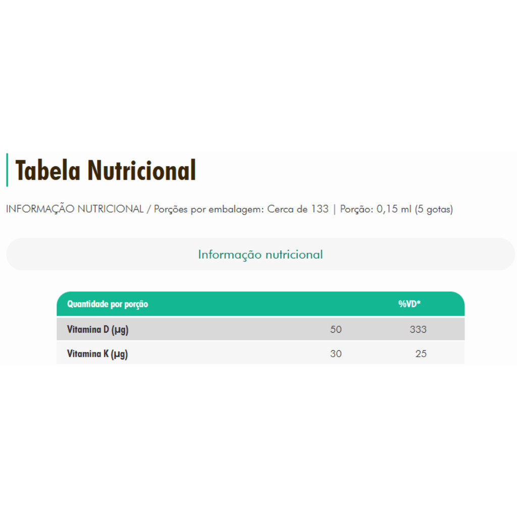 Sobre o Produto: O Vit D3K2 Em Gotas 20ml da Nutrify é um suplemento alimentar desenvolvido para promover o bem-estar geral, especialmente em relação à saúde óssea, cardiovascular e imunológica. A fórmula combina as vitaminas D3 (colecalciferol) e K2 (menaquinona), nutrientes essenciais para a absorção de cálcio no organismo e o bom funcionamento dos ossos, dentes e sistema imunológico. Este suplemento é apresentado em forma líquida, proporcionando uma forma prática e de fácil dosagem. Como Consumir - A recomendação de consumo é de 10 gotas ao dia, preferencialmente junto às refeições. - O produto deve ser consumido diretamente ou diluído em água ou outra bebida de sua preferência. - A dosagem diária pode ser ajustada conforme orientação de um profissional de saúde. Benefícios - Fortalece os ossos e dentes: A vitamina D3 auxilia na absorção de cálcio, enquanto a vitamina K2 ajuda a direcionar o cálcio para os ossos e dentes, evitando depósitos indevidos em outros tecidos. - Apoia o sistema imunológico: A vitamina D3 desempenha um papel crucial no fortalecimento do sistema imunológico, auxiliando na defesa do organismo contra infecções. - Saúde cardiovascular: A vitamina K2 tem efeitos benéficos no sistema cardiovascular, ajudando a prevenir a calcificação das artérias. - Absorção eficiente de nutrientes: A combinação de D3 e K2 favorece a melhor utilização do cálcio no organismo, promovendo uma melhor saúde óssea e metabólica. - Praticidade: O formato líquido em gotas permite uma dosagem precisa e facilita a ingestão para pessoas com dificuldades em engolir cápsulas ou comprimidos. Alergênicos - Este produto não contém glúten, lactose, soja, corantes ou conservantes artificiais. - Recomenda-se verificar a lista completa de ingredientes antes de consumir para garantir que não haja reações alérgicas a componentes específicos. Ingredientes - Óleo de girassol, Vitamina D3 (colecalciferol), Vitamina K2 (menaquinona), Vitamina E (tocoferol), Ácido ascórbico (vitamina C), Ácido oleico. - Não contém glúten, lactose ou conservantes artificiais. Advertências - Este produto não deve ser utilizado como substituto de uma alimentação equilibrada e saudável. - Mantenha fora do alcance de crianças. - Caso esteja grávida, amamentando, ou faça uso de medicamentos, consulte um médico antes de utilizar o produto. - Não exceda a dose recomendada. - Conservar em local seco, fresco e ao abrigo da luz. - Após aberto, consumir preferencialmente em até 60 dias. Conclusão: Vit D3K2 Em Gotas 20ml da Nutrify é um suplemento completo e eficaz para manter a saúde óssea, cardiovascular e imunológica em dia. Sua combinação de vitaminas D3 e K2, aliada à praticidade do formato líquido, torna este produto uma excelente opção para quem busca otimizar a absorção de cálcio e promover o bem-estar geral.