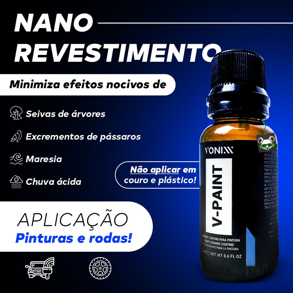 Vitrificador Automotivo Pintura Brilho V-Paint 20ml Vonixx • Brilho profundo • Durabilidade de até 2 anos • Hidrorrepelente • Proteção UV • À base de SiO2 PINTURA PROTEGIDA, COM TOQUE AVELUDADO E ALTO BRILHO O V-Paint é um ceramic coating para pintura com durabilidade de até 2 anos! PROTEÇÃO UV Promove proteção contra os danos causados pelos raios solares HIDRORREPELÊNCIA Cria uma camada hidrorrepelente que facilita a limpeza. NANO REVESTIMENTO Minimiza efeitos nocivos de seivas de árvores, excrementos de pássaros, maresia e chuva ácida. FÁCIL APLICAÇÃO Basta aplicar o produto com o auxílio do aplicador contido na embalagem, envolto na microfibra de suede. DICAS DE MANUTENÇÃO • Evitar produtos ácidos, básicos ou solventes. • Primeira lavagem após 6 dias da aplicação. • Uso de Toalha de Secagem em caso de chuva antes da cura total • Evitar ceras limpadoras sobre camada vitrificada. • Em caso de entupimento do bico, utilize um grampo ou agulha e lave o aplicador para evitar solidificação. IMPORTANTE! Revestimentos à base de sílica podem formar marcas de água nos primeiros 6 dias após aplicados. Para minimizar isso, use SiO2-PRO após 4 dias do V-Paint. Ele reduz as marcas, proporciona toque aveludado e alto brilho, prolongando a vida útil da camada vitrificada. USO RECOMENDADO Pinturas e rodas. ** Não recomendamos aplicação do V-Paint em couro e plástico. ESPECIFICAÇÕES TÉCNICAS: - Disponível em: 20ml - Diluição: Pronto uso - Durabilidade: Até 2 anos - Tempo de Cura Parcial: 6hrs - Tempo de Cura Total: 72hrs - Rendimento: 1 veículo CONTEÚDO DA EMBALAGEM: - 01 Vitrificador de Pintura V-Paint 20ml Vonixx - 01 Lenço auxiliar - 01 Esponja aplicadora - 01 Manual de Aplicação - 01 Adesivo Vonixx