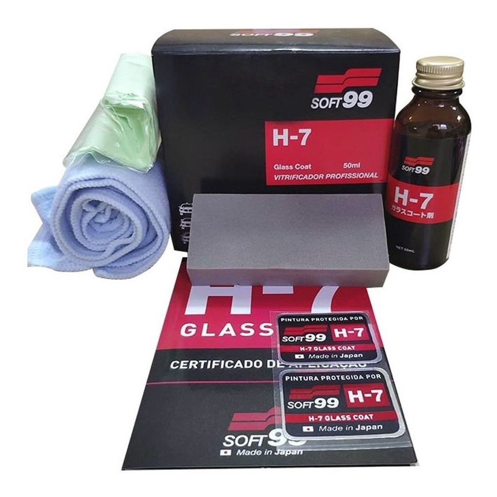 Glass Coat H7 é um vitrificador de pintura, com acabamento perfeito, dureza 7H e forte aderência ao verniz, peças plásticas, farol, lanterna, pintura fosca, vinil fosco. Protege contra raios UB, ação do tempo, facilita a lavagem e secagem do veículo, diminuindo consideravelmente as possibilidades de gerar microrriscos. Sua proteção pode chegar até 3 anos, efetuando lavagens e manutenções da vitrificação de maneira correta, utilizando produtos específicos para manutenção de coating. Especificações Técnicas: • Peso: 50ml • Textura: Líquida • Nível de Brilho: 9 • Nível de Repelência: 10 • Nível de Proteção 7H • Acompanha Kit Aplicador • Rendimento de até 2 carros • Durabilidade de até 3 anos Aplicação: 1 - Prepare a peça com polimento especializado; 2 - Descontamine toda a superfície com lavagem ou álcool isopropílico; 3 - A superfície deverá está completamente seca, livre de qualquer tipo de umidade; 4 - Umedecer o suede que acompanha o produto com líquido do frasco, espalhando uma camada fina e uniforme sobre a pintura; 5 - Aguarde Secar por cerca de 5 minutos no verão ou 15 minutos no inverno antes de lustrar (este tempo é variável de acordo com as condições climáticas); 6 - Remova o excesso com a toalha especial que acompanha o produto, fazendo o lustro em uma única direção. Cuidados: 1 - Não aplicar em ambiente com vento ou poeira; 2 - Use os panos aplicadores apenas uma vez; 3 - Não deixe secar por um período maior do que o recomendado; 4 - Mantenha a superfície seca por pelo menos 24 horas após a aplicação; 5 - Evitar contato com roupas, pois poderá manchar; 6 - Tampe o recipiente firmemente após o uso e guarde em local fresco, arejado e seguro. 7 - Aplique em local com boa iluminação. ATENÇÃO: PRODUTO INDICADO PARA USO PROFISSIONAL. Procure por um representante SOFT99 mais próximo para obter sua certificação. NÃO UTILIZE ESTE PRODUTO SEM TER CONHECIMENTO TÉCNICO. Conteúdo da Embalagem: • 01 Vitrificador H-7 50ml • 01 Par de Luvas de Proteção • 01 Taco de EVA de aplicação • 01 Tecido de Aplicação • 01 Toalha de Ilustro • 02 Certificados de Aplicação • 02 Emblemas de Pintura Protegida Importante: • Garantia de 273 Dias.