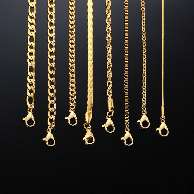 Descrição do produto em inglês após português condição! 100% nova de alta qualidade 1. Acessórios de moda, preço imbatível 2. Indicado para qualquer estilo de moda. 3. Seguro e confortável, dando-lhe o visual mais fascinante. 4. Material: Folheado a ouro 18K 5. Cor: Dourado 6. Especificações: (largura: 1mm.2mm.2,4mm,3mm,4,5mm,5mm) Comprimento: 11 polegadas - 24 polegadas 8. O pacote inclui: 1 * Colar 9. Gênero: Masculino Feminino 10. Ocasião: casamento, noivado, festa, lazer ************************************************** Description: condition! 100% new high quality 1. Fashion accessories, unbeatable price 2. Suitable for any fashion style. 3. Safe and comfortable, giving you the most fascinating look. 4. Material: 18K gold plated 5. Color: Gold 6. Specifications: (width: 1mm.2mm.2.4mm,3mm,4.5mm,5mm) Length: 11 inches - 24 inches 8. Package includes: 1 * Necklace 9. Gender: Male Female 10. Occasion: wedding, engagement, party, leisure