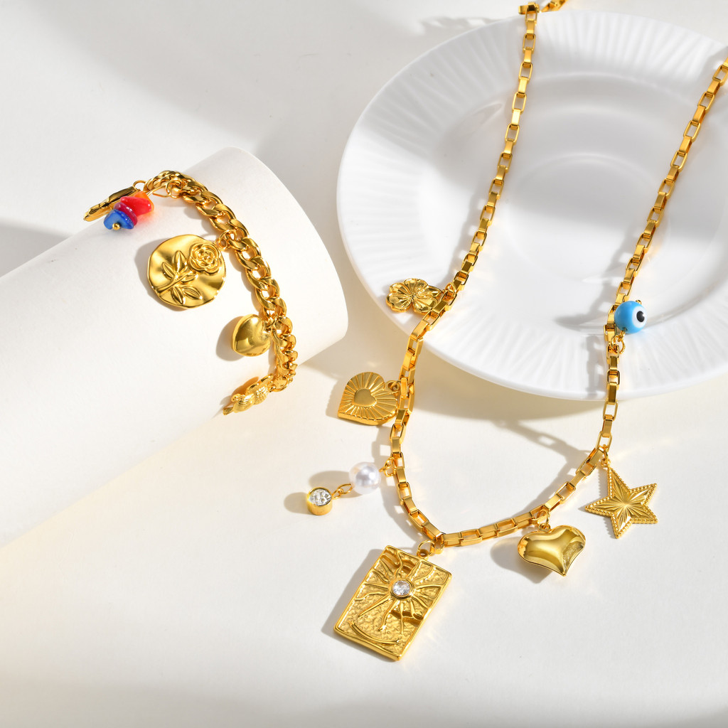 Vnox Aço Inoxidável Banhado A Ouro Coração Flor Sol Estrela Artesanal Corrente Pulseira Colar Jóias De Luxo Presentes