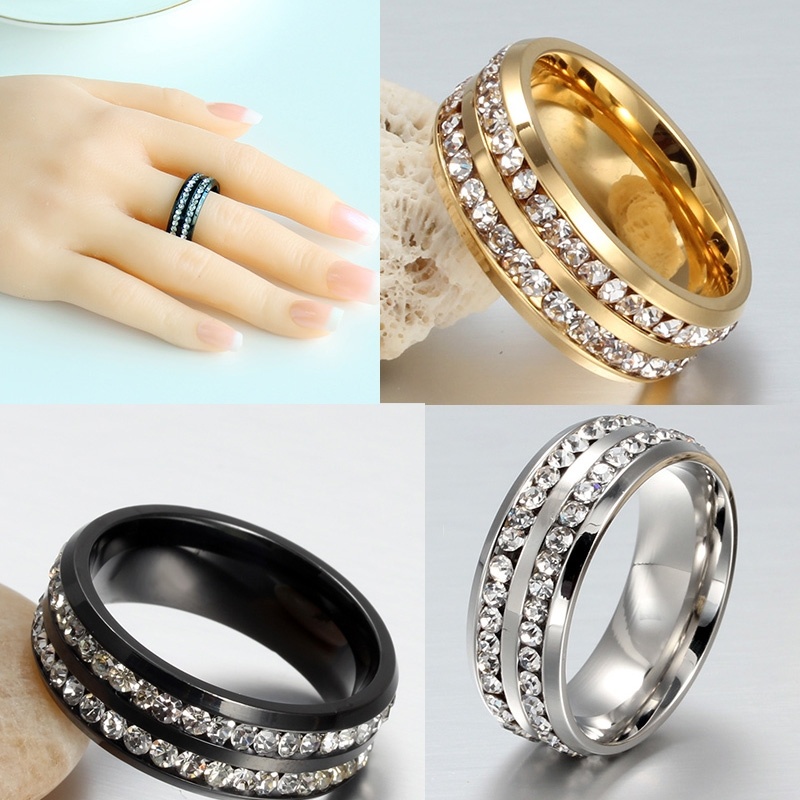 Descrição do produto em inglês após português Tipo de Item: Anéis Material: Cristal Forma\ padrão: Redondo Estilo: Na moda Ocasião: Casamento Tipo de anéis: Anel de coquetel Gênero: Mulheres Tipo de metais: Aço Inoxidável Largura da superfície: 8mm Modelo: Mulheres e homens Cristal: Duas linhas de cristal ************************************************** Description: Item Type: Rings Material: Crystal Shape\pattern: Round Style: Trendy Occasion: Wedding Rings Type: Cocktail Ring Gender: Women Metals Type: Stainless Steel Surface Width: 8mm model: women and men crystal: two row crystal