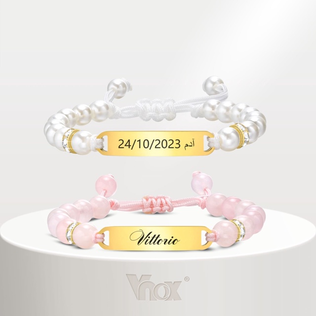 Vnox Free Engrave Pearl Pink Crystal Beads Pulseira Para Menina , 18K Gold Com Nome Personalizado Ajustável