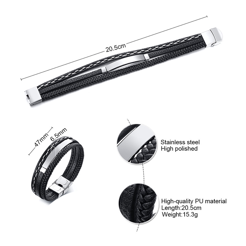 Vnox Jóias Masculino Personalizado Gravado Preto Pulseira De Couro Trançado De Aço Inoxidável Pulseiras Da Moda
