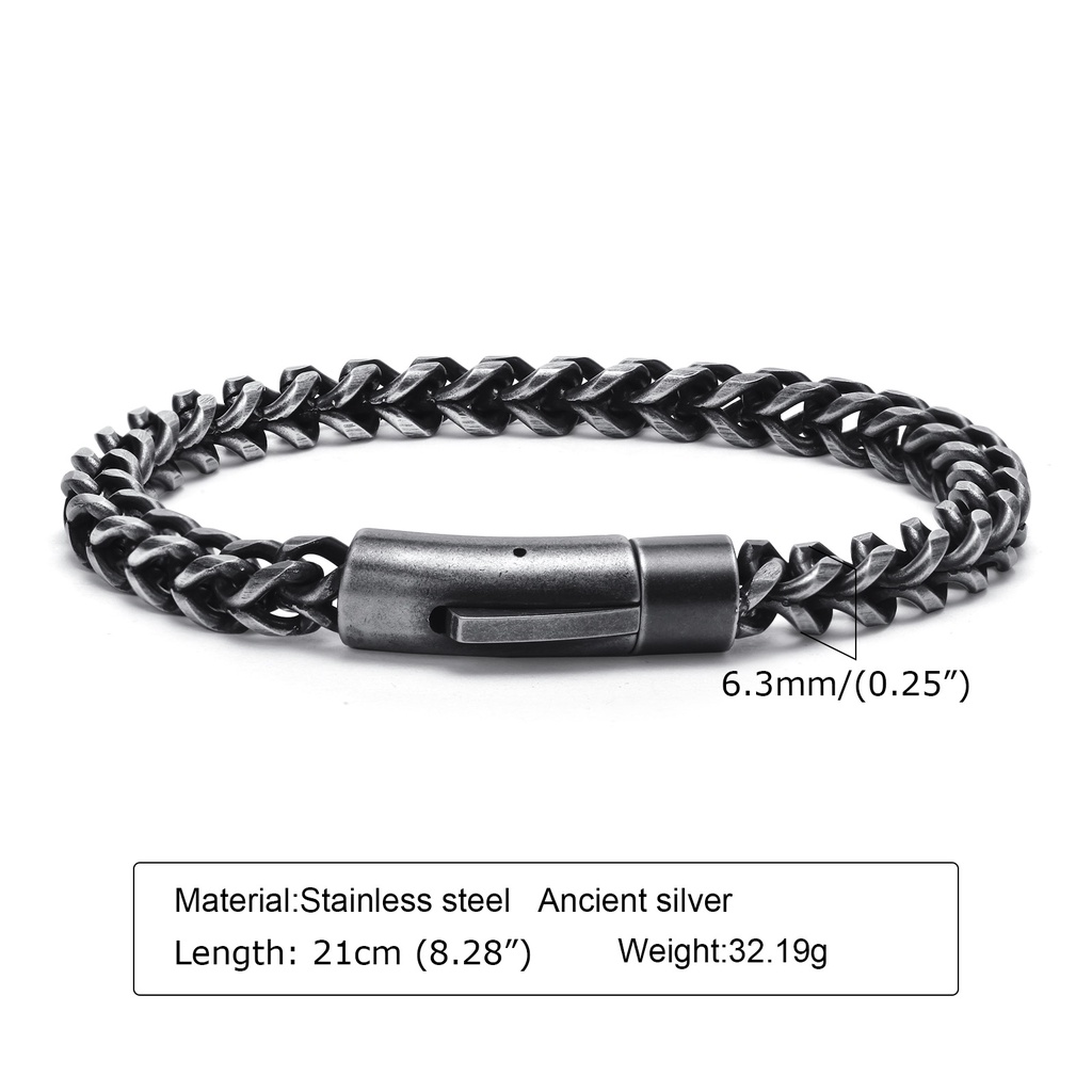 Material: aço inoxidável de alta qualidade Estilo: moda Cor: Cinza Antigo Tamanho: Comprimento 21CM; Largura da Corrente 6,3MM (botão de pressão) Objetos de presente: amigos, amantes, família. Dia dos Namorados. Aniversárioocasião: Desgaste diário/festa/presente/engajamento/aniversário/casamento Padrão ambiental: chumbo, níquel, sem cádmio Dropshipping/pedidos a granel: Sim Serviço Global de venda direta disponível: sem logotipos, sem recibos, sem anúncios Cuidados com as joias: Evite produtos químicos / Evite suor / Evite colisões / Limpe com pano macio / Mantenha-se bem / substitua o desgaste