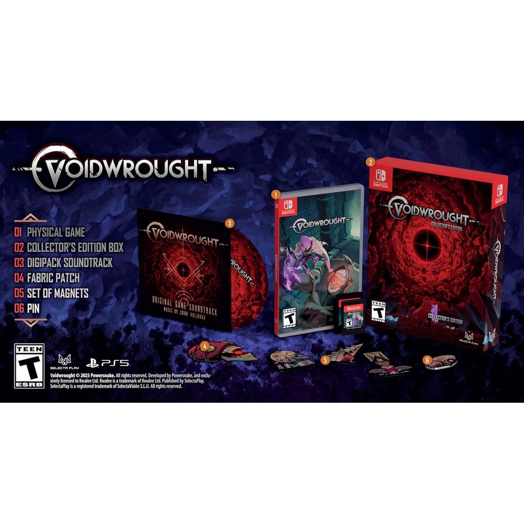 VOIDWROUGHT COLLECTORS EDITION SWITCH**PRODUTO 100% ORIGINAL, LACRADO E COM NOTA FISCAL****PRONTA ENTREGA - ENVIO IMEDIATO**- Mídia: Física (disco ou cartucho no caso se for Nintendo);- Console: Compatível com Nintendo SWITCH, LITE E OLED;- Versão: Importada;- Áudio: Inglês; Legenda ou Texto: Inglês, Espanhol, Francês, Japonês, Português;- Jogadores: 1; CONTEÚDO DA EMBALAGEM: 1 (um) Jogo VOIDWROUGHT COLLECTORS EDITION SWITCH; Trilha sonora em Digipack, Patch de tecido; Conjunto de ímãs; Broche; IMAGENS MERAMENTE ILUSTRATIVASTodas as informações divulgadas são de responsabilidade do Fabricante/FornecedorGARANTIA: 90 dia(s) de Garantia - Produto 100% Original. A nota fiscal garante contra defeito de fabricação!**ATENÇÃO**Antes de finalizar a compra, pergunte quantas vezes for necessário e tire todas as suas dúvidas. Nossa equipe de vendedores está à disposição para auxiliar. Se não conseguir localizar o item que precisa ou se necessitar de mais alguma informação sobre o produto entre em contato conosco (GAMER HUT STORE).SOBRE O JOGO A chegada da Estrela Escarlate anuncia uma nova era. Após sair do casulo, o dever do Simulacro é coletar Icor, o sangue dos deuses, das monstruosidades que o acumulam.Voidwrought é um jogo de plataforma e ação rápido com travessias intensas, diferentes habilidades e batalhas contra chefes formidáveis. Encontre e equipe Relíquias e Almas poderosas para personalizar o seu estilo de jogo. Escave os destroços da Cidade Cinzenta e construa um santuário repleto de seguidores fiéis.Explore além da superfícieDesça até as profundezas da superfície queimada pela estrela e explore os abismos multidimensionais. Testemunhe os festejos corrompidos da Corte, perca-se nos túneis congelados das Águas Passadas e descubra o destino cruel da Expedição Abandonada.Com controles precisos, exploração imersiva e uma história envolvente a ser revelada, Voidwrought é uma adição dinâmica ao gênero moderno Metroidvania.Desperte o poder dos ArtefatosO mundo está repleto de tesouros cobiçados pelos cultos, pelos corajosos e pelos loucos. Investigue os salões do seu santuário, vasculhe cadáveres de divindades derrotadas e varra os quatro cantos do universo em busca de objetos capazes de conceder poderes únicos.