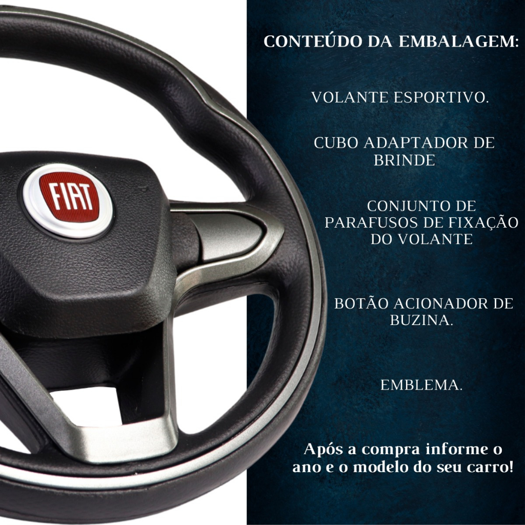 ESPECIFICAÇÃO TÉCNICA • Diâmetro de 370mm; • Profundidade de 120mm. MODELOS COMPATÍVEIS • CV109 • Uno • Fire • Mille • Marea • Palio • Brava • Idea • Siena • Strada • Punto • Stilo • Ducato • Doblô 2001 em diante Caso não tenha encontrado o modelo do seu veículo neste anúncio, nos consulte. IMPORTANTE • Garantia de 3 Meses; • Somos FABRICANTES ESPECIALIZADOS no segmento automotivo, seguimos um processo rigoroso de fabricação e qualidade; • Entrega ágil e rápida após sua compra; • Enviamos todos os nossos volantes com CUBO ADAPTADOR; • Após a instalação, perde-se a função AIRBAG; • RECOMENDAMOS QUE A INSTALAÇÃO SEJA FEITA POR PROFISSIONAL ESPECIALIZADO. • Fabricamos volantes em POLIURETANO RESISTENTE; • Nossos volantes possuem similaridade ao original com acabamento texturizado e acionamento da buzina. Sua satisfação é nossa maior recompensa! Estamos à disposição e teremos o imenso prazer em atendê-lo!