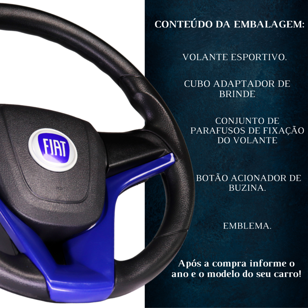 ESPECIFICAÇÃO TÉCNICA • Diâmetro de 370mm; • Profundidade de 120mm. COMPATIBILIDADES: • Fiat Uno Fire/Mille 2001 Em Diante • Fiat Palio 1996 À 2017 • Fiat Palio Weekend 1996 À 2017 • Fiat Marea 1998 À 2007 • Fiat Brava 1999 À 2003 • Fiat Idea 2005 À 2016 • Fiat Siena 1997 À 2021 • Fiat Strada 1998 À 2020 • Fiat Punto 2007 À 2017 • Fiat Stilo 2002 À 2010 • Fiat Ducato 1998 Em Diante • Fiat Doblô 2002 Em Diante • Fiat Fiorino 2005 Em Diante • Fiat Mobi 2016 Em Diante • Fiat Linea 2008 À 2017 Caso não tenha encontrado o modelo do seu veículo neste anúncio, nos consulte. IMPORTANTE • Garantia de 3 Meses; • Somos FABRICANTES ESPECIALIZADOS no segmento automotivo, seguimos um processo rigoroso de fabricação e qualidade; • Entrega ágil e rápida após sua compra; • Enviamos todos os nossos volantes com CUBO ADAPTADOR; • Após a instalação, perde-se a função AIRBAG; • RECOMENDAMOS QUE A INSTALAÇÃO SEJA FEITA POR PROFISSIONAL ESPECIALIZADO. • Fabricamos volantes em POLIURETANO RESISTENTE; • Nossos volantes possuem similaridade ao original com acabamento texturizado e acionamento da buzina. APÓS A COMPRA INFORMAR ANO E MODELO DO VEÍCULO EM NOSSO CHAT. Sua satisfação é nossa maior recompensa! Estamos à disposição e teremos o imenso prazer em atendê-lo!