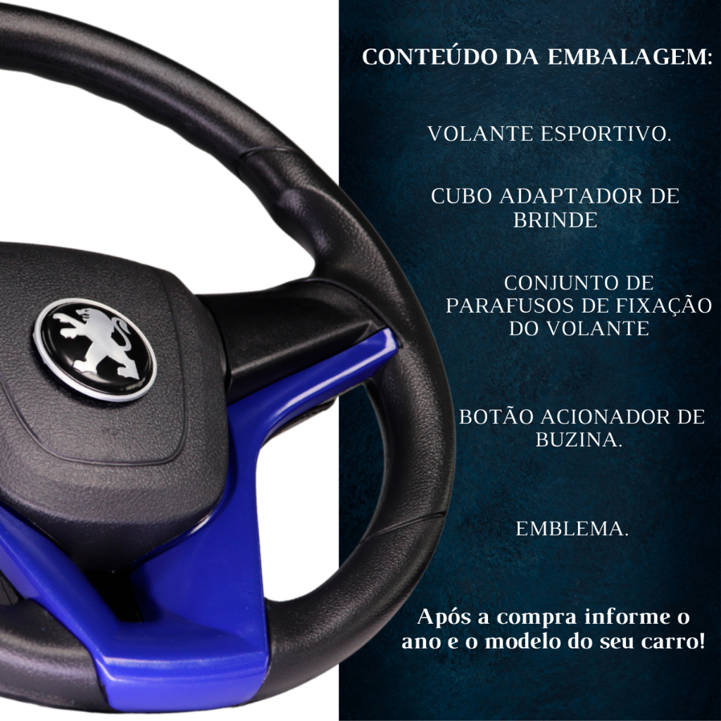 ESPECIFICAÇÃO TÉCNICA • Diâmetro de 370mm; • Profundidade de 120mm. COMPATIBILIDADES: • Peugeot 208 anos 2012 até 2019 • Peugeot 308 anos 2007 até 2021 • Peugeot 408 anos 2012 até 2016 • Peugeot 508 anos 2008 em diante • Peugeot 2008 anos 2013 em diante • Peugeot 3008 anos 2008 em diante • Peugeot 5008 anos 2009 em diante • Peugeot Partner 1996 em diante • Peugeot Expert 1995 em diante • Peugeot Boxer 1994 em diante Caso não tenha encontrado o modelo do seu veículo neste anúncio, nos consulte. IMPORTANTE • Garantia de 3 Meses; • Somos FABRICANTES ESPECIALIZADOS no segmento automotivo, seguimos um processo rigoroso de fabricação e qualidade; • Entrega ágil e rápida após sua compra; • Enviamos todos os nossos volantes com CUBO ADAPTADOR; • Após a instalação, perde-se a função AIRBAG; • RECOMENDAMOS QUE A INSTALAÇÃO SEJA FEITA POR PROFISSIONAL ESPECIALIZADO. • Fabricamos volantes em POLIURETANO RESISTENTE; • Nossos volantes possuem similaridade ao original com acabamento texturizado e acionamento da buzina. APÓS A COMPRA INFORMAR ANO E MODELO DO VEÍCULO EM NOSSO CHAT. Sua satisfação é nossa maior recompensa! Estamos à disposição e teremos o imenso prazer em atendê-lo!"