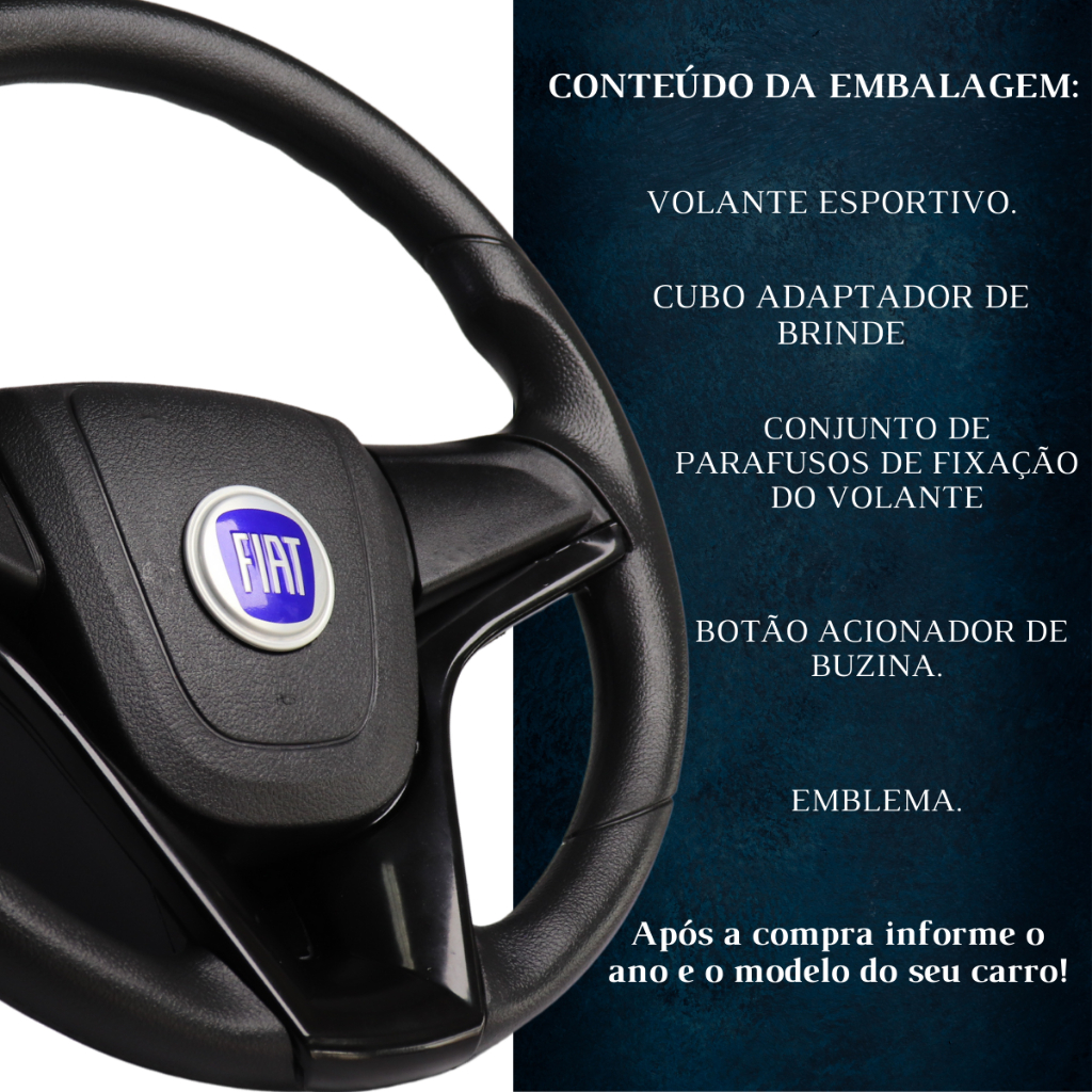 ESPECIFICAÇÃO TÉCNICA • Diâmetro de 370mm; • Profundidade de 120mm. COMPATIBILIDADES: • Fiat Uno Fire/Mille 2001 Em Diante • Fiat Palio 1996 À 2017 • Fiat Palio Weekend 1996 À 2017 • Fiat Marea 1998 À 2007 • Fiat Brava 1999 À 2003 • Fiat Idea 2005 À 2016 • Fiat Siena 1997 À 2021 • Fiat Strada 1998 À 2020 • Fiat Punto 2007 À 2017 • Fiat Stilo 2002 À 2010 • Fiat Ducato 1998 Em Diante • Fiat Doblô 2002 Em Diante • Fiat Fiorino 2005 Em Diante • Fiat Mobi 2016 Em Diante • Fiat Linea 2008 À 2017 Caso não tenha encontrado o modelo do seu veículo neste anúncio, nos consulte. IMPORTANTE • Garantia de 3 Meses; • Somos FABRICANTES ESPECIALIZADOS no segmento automotivo, seguimos um processo rigoroso de fabricação e qualidade; • Entrega ágil e rápida após sua compra; • Enviamos todos os nossos volantes com CUBO ADAPTADOR; • Após a instalação, perde-se a função AIRBAG; • RECOMENDAMOS QUE A INSTALAÇÃO SEJA FEITA POR PROFISSIONAL ESPECIALIZADO. • Fabricamos volantes em POLIURETANO RESISTENTE; • Nossos volantes possuem similaridade ao original com acabamento texturizado e acionamento da buzina. APÓS A COMPRA INFORMAR ANO E MODELO DO VEÍCULO EM NOSSO CHAT. Sua satisfação é nossa maior recompensa! Estamos à disposição e teremos o imenso prazer em atendê-lo!