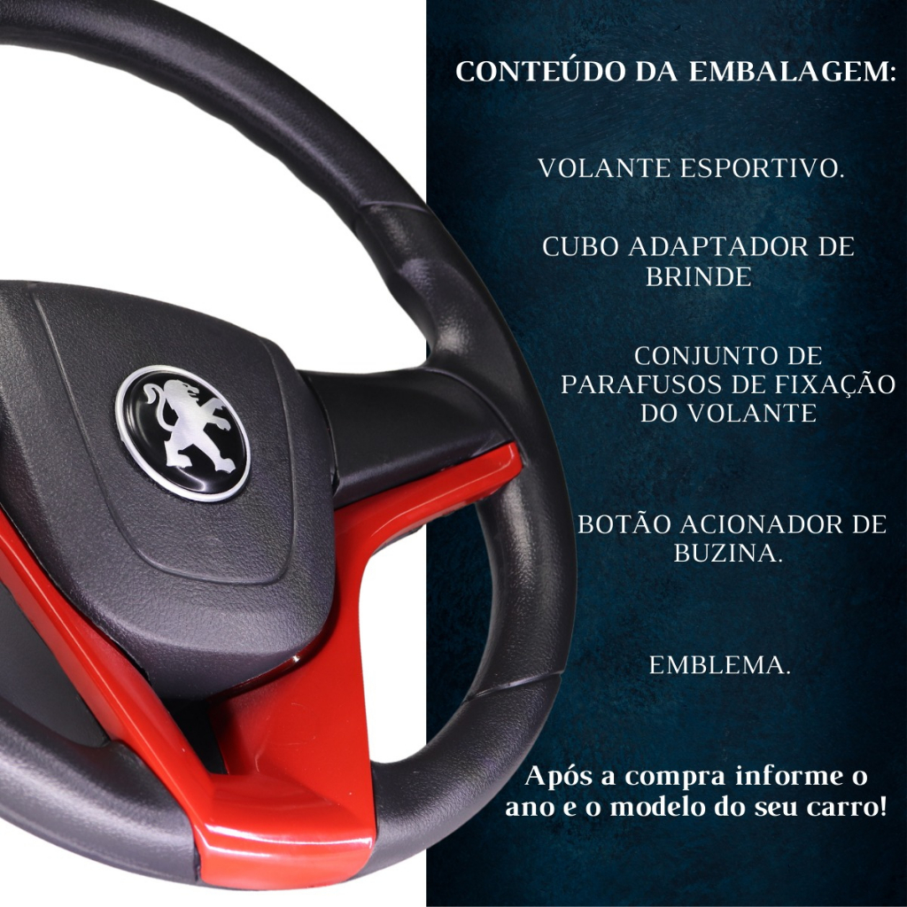 ESPECIFICAÇÃO TÉCNICA • Diâmetro de 370mm; • Profundidade de 120mm. COMPATIBILIDADES: • Peugeot 208 anos 2012 até 2019 • Peugeot 308 anos 2007 até 2021 • Peugeot 408 anos 2012 até 2016 • Peugeot 508 anos 2008 em diante • Peugeot 2008 anos 2013 em diante • Peugeot 3008 anos 2008 em diante • Peugeot 5008 anos 2009 em diante • Peugeot Partner 1996 em diante • Peugeot Expert 1995 em diante • Peugeot Boxer 1994 em diante Caso não tenha encontrado o modelo do seu veículo neste anúncio, nos consulte. IMPORTANTE • Garantia de 3 Meses; • Somos FABRICANTES ESPECIALIZADOS no segmento automotivo, seguimos um processo rigoroso de fabricação e qualidade; • Entrega ágil e rápida após sua compra; • Enviamos todos os nossos volantes com CUBO ADAPTADOR; • Após a instalação, perde-se a função AIRBAG; • RECOMENDAMOS QUE A INSTALAÇÃO SEJA FEITA POR PROFISSIONAL ESPECIALIZADO. • Fabricamos volantes em POLIURETANO RESISTENTE; • Nossos volantes possuem similaridade ao original com acabamento texturizado e acionamento da buzina. APÓS A COMPRA INFORMAR ANO E MODELO DO VEÍCULO EM NOSSO CHAT. Sua satisfação é nossa maior recompensa! Estamos à disposição e teremos o imenso prazer em atendê-lo!
