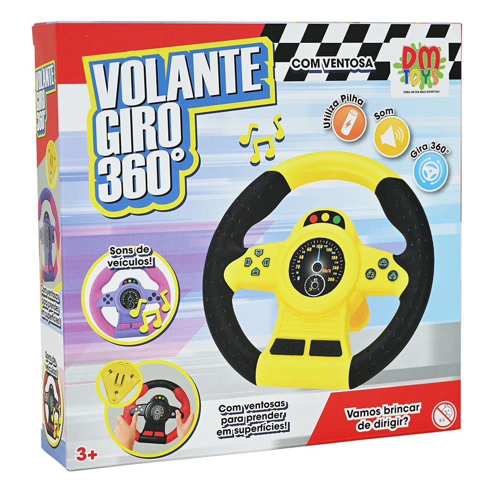O Volante Giro 360º é muito legal. Ele tem som de partida de carro, som de veículos e música. Vem com ventosa para fixar em qualquer superfície. Brincar de dirigir vai ser mais divertido com Volante Giro 360º! *** Somente os dois botões pretos de baixo fazem som, os outros são decorativos *** IDADE RECOMENDADA: Acima de 03 (três) anos CONTEÚDO DA EMBALAGEM: 01 Volante Giro 360º 01 suporte com ventosa OUTRAS INFORMAÇÕES: Com música e som Cores sortidas Utiliza 02 pilhas "AA" (não incluídas) Medida: 20 cm Composição: Plástico PP REGISTRO INMETRO: 002 918/2024