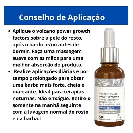 Grandha vita hominis volcano power crescimento da barba Grandha vita hominis volcano power estimula o crescimento da barba Estimula o crescimento da barba ao fortalecer e biomodular o folículo piloso. O volcano power growth factors carrega consigo um complexo conjunto de fatores e cofatores de crescimento nanoparticulados. Este conjunto é biocompatível com a pele e enriquecido com óleos essenciais delicadamente selecionados, tais como: Tomilholavandahortelã-pimenta alecrim. Este blend excepcional dá forma a um sistema inteligente de liberação controlada, o qual favorece o metabolismo folicular e acelera o crescimento dos pelos. Uma barba mais forte, densa e marcante para o homem urbano. Fórmula poderosa que atua sob um princípio de ação combinada. Diversifica rotas de atuação, promove vasodilatação na pele e nutrição aprimorada aos folículos da barba. Conselho de Aplicação: Aplique o volcano power growth factors sobre a pele do rosto, após o banho e/ou antes de dormir. Faça uma massagem suave com as mãos para uma melhor absorção do produto. Realize aplicações diárias e por tempo prolongado para obter uma barba mais forte, cheia e marcante. Ideal para terapias noturnas. Não enxágue. Retire-o somente na manhã seguinte com a lavagem normal do rosto e da barba. A linha vita hominis é a linha masculina da grandha para barba e cabelo. A verdadeira essência do homem, traduzida numa experiência elegante e sofisticada baseada em ativos naturais como óleos essenciais e extratos vegetais, ativos de alta tecnologia e performance. Imagens ilustrativas Especificações técnicas: Contém: - 01 grandha vita hominis volcano power crescimento da barba Quem somos : A Locus é uma loja online, que oferece produtos nacionais e importados no Brasil. , temos orgulho desse sucesso e hoje conquistamos clientes em todo o Brasil, o resultado para nosso sucesso é simples, entregamos exatamente o que prometemos para atender todas as expectativas dos nossos clientes. Servir bem, para servir sempre. Obrigada!!!