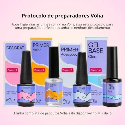 Ordem certinha de uso (preparo da unha com Vòlia) 1. Higienizador / Prep das mãos e unhas Objetivo: tirar sujeira, microrganismos e deixar a unha pronta para receber os produtos. 2. Desidrat Vòlia (PREPARADOR – passo 1) Função: remover oleosidade e umidade da placa ungueal, preparando para o primer. 3. Primer (ácido ou sem ácido, conforme o sistema que você usa) Normalmente a Vòlia trabalha com primer após o Desidrat: Da dúvida de qual primer usar: Primer Ácido: para unhas com maior descolamento e/ou mãos que suam muito. Primer Adesivador: todos os tipos de unhas Se tiver muito problemas com descolamento, pode ser usado os dois em conjunto, para maior aesão Função: criar ponte de adesão entre a unha e o gel/base, evitando descolamento. 4. Base em gel / Gel base Função: fazer a “ancoragem” do alongamento ou do gel de construção. 5. Gel de construção / alongamento Aqui entra o produto principal que você estiver usando da Vòlia: * A Volia tem 4 diferentes tipos de gel, Hybrid, Classic, classic Hard e Control Hybrid: Último Lançamento, viscosidade híbrida, média a alta, o melhor para trabalhar com Molde F1, autonivelante e cobertura moderada Classic: o tradicional, viscosidade média, autonivelante, cobertura natural Classic Hard: ideal para ser usado na borda livre do alongamento, alto ardor Control: Alta Viscosidade, Nivelamento Controlado, Alta Cobertura 8. Finalizador / Top coat * Finalizador de Alto Brilho, sem goma, maior resistência a riscos.