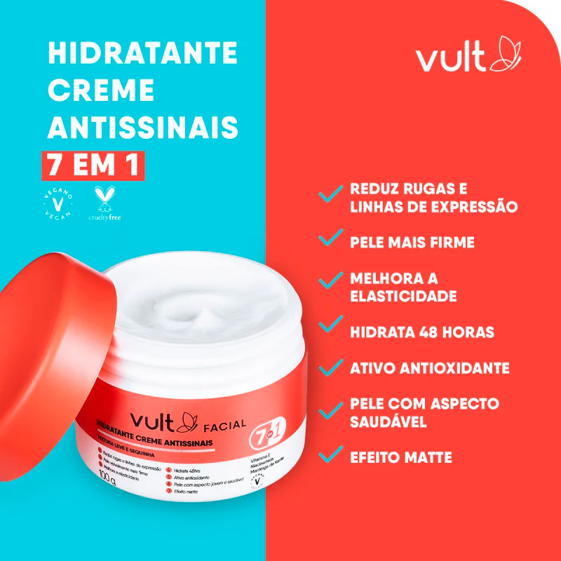 Vult Care Antissinais Creme hidratante facial. Vult Care Antissinais com ação 7 em 1, deixa a pele com aspecto jovem, saudável e radiante. O Creme Potinho Hidratante Facial Vult Care Antissinais oferece 48hrs de hidratação e conta com Vitamina E, poderoso ativo antioxidante, Niacinamida e Manteiga de Karité para uma ação antissinais que reduz rugas, linhas de expressão e deixa a pele visivelmente mais firme. Possui textura leve de rápida absorção e acabamento matte. Ingredientes que compõem esse produto ÁGUA; GLICEROL; MANTEIGA DE BUTYROSPERMUM PARKII; ÁLCOOL CETOESTEARÍLICO; NICOTINAMIDA; TRIGLICERÍDEO CAPRÍLICO/CÁPRICO; OCTENILSUCCINATO DE AMIDO ALUMÍNIO; FENOXIETANOL; COPOLÍMERO DE ACRILATO DE HIDROXIETILA/TAURATO DE ACRILOILDIMETIL SÓDICO; TROLAMINA; CROSPOLÍMERO DE ACRILATOS/ACRILATO DE ALQUILA C10-30; CAPRILILGLICOL; ISOEXADECANO; PERFUME; TOCOFEROL; GOMA XANTANA; POLISSORBATO 60; GLICONATO DE SÓDIO; ISOESTEARATO DE SORBITANA; ÁCIDO LÁCTICO. Como Usar Conselho de Aplicação À noite, com o rosto limpo e seco, aplique o produto por todo rosto e pescoço, massageando suavemente. Usar diariamente.