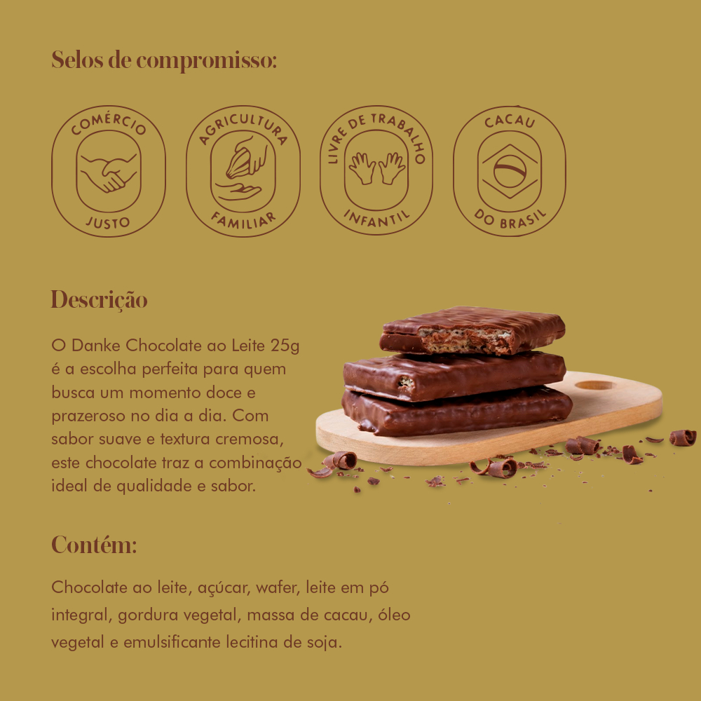 O Wafer Recheio e Cobertura Chocolate ao Leite Danke 25g traz crocância e cremosidade em perfeita harmonia. Cada pedaço combina o sabor suave do chocolate ao leite com a leveza do wafer, criando um snack delicioso para qualquer hora do dia. Feito com cacau de origem brasileira, o Wafer Danke ao Leite reflete o compromisso da marca com qualidade, rastreabilidade e práticas sustentáveis. Ideal para matar a vontade de chocolate com equilíbrio e sabor genuíno. Dica: experimente gelado nos dias quentes — o contraste entre o wafer crocante e o chocolate cremoso fica ainda mais irresistível. Crocante e cremoso: wafer leve coberto com chocolate ao leite. Perfeito para qualquer hora: snack prático e saboroso para o dia a dia. Cacau de origem brasileira: produzido com rastreabilidade e sustentabilidade. Compromisso Danke: união entre sabor, qualidade e sustentabilidade. Peso líquido 25 g PS: ( não achei a tabela nutricional e tamanho da embalagem)