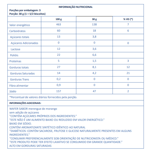 Wafer Morango Linea 90g, uma combinação perfeita de crocância e sabor frutado. Com camadas finas de massa crocante e um recheio cremoso de morango, cada mordida proporciona uma experiência refrescante e irresistível. Ideal para lanches ou sobremesas, sua embalagem prática é perfeita para levar a qualquer lugar. Experimente o Wafer Morango Linea e adicione um toque doce e frutado ao seu dia! INGREDIENTES farinha de trigo enriquecida com ferro e ácido fólico, gordura vegetal, soro de leite em pó parcialmente desmineralizado, permeado de soro de leite em pó, sal,edulcorantes: maltitol e glicosídeos de esteviol de stevia rebaudiana bertoni,aromatizante, emulsificante lecitina, fermento químico bicarbonato de sódio ecorante natural carmins. ALÉRGICOS: CONTÉM DERIVADOS DE TRIGO, SOJA E LEITE.PODE CONTER CENTEIO, CEVADA, AVEIA. CONTÉM LACTOSE. CONTÉM GLÚTEN