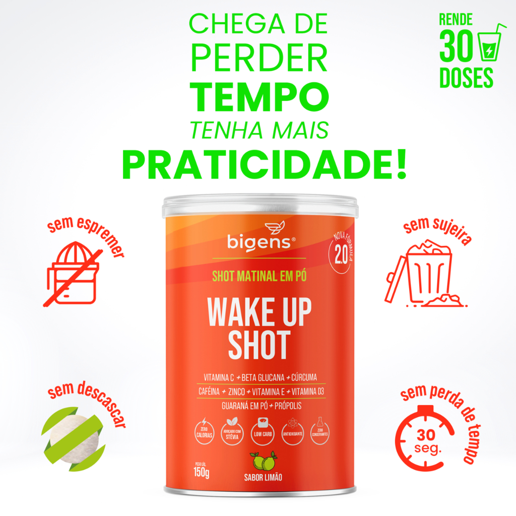 Biogens agora é Bigens! WAKE UP SHOT MATINAL 9 INGREDIENTES EM APENAS 1 SHOT 150g O Wake Up Shot é o suplemento que você precisa para revolucionar sua rotina! Com um sabor delicioso de limão e uma combinação única de ingredientes de alta qualidade, esse suplemento foi desenvolvido pensando em proporcionar praticidade para o seu dia a dia. Especialmente formulado com limão, vitamina C, gengibre, cúrcuma, extrato de própolis, guaraná, zinco e spirulina. DESPERTE SEU CORPO E MENTE O suplemento ideal para dar um UP na sua rotina! Com uma poderosa combinação de ingredientes nutritivos, esse shot é perfeito para aqueles que buscam uma dose extra de energia e bem-estar. PRATICIDADE PARA O SEU DIA! O Wake Up Shot é a solução perfeita para quem tem uma vida corrida e busca uma forma rápida e fácil de se manter saudável e energizado. Prático e fácil, você pode levar seu shot para onde quiser. SABOR QUE CONQUISTA! A refrescância e o sabor marcante do limão fazem do Wake Up Shot uma opção irresistível para quem deseja começar o dia com uma explosão de sabor e disposição. Além disso, a fórmula equilibrada do produto garante que todos os ingredientes se harmonizem perfeitamente, criando uma experiência única ao paladar. ADAPTA-SE À SUA ROTINA! O Wake Up Shot é perfeito para qualquer estilo de vida. Seja para aqueles que buscam um impulso energético antes do treino, para quem precisa de uma dose extra de vitalidade durante o trabalho, aos que querem quebrar seu desjejum e os que apenas procuram melhorar seu sistema imune, esse suplemento se adapta às suas necessidades e te acompanha em todas as etapas do dia. Sua fórmula cuidadosamente selecionada trabalha para garantir que você esteja sempre protegido e pronto para enfrentar os desafios cotidianos. O Wake Up Shot é o produto que você não pode deixar de experimentar. Com ele, você terá a combinação perfeita de sabor, praticidade, saúde e imunidade em um só suplemento, a melhor opção para manter sua energia, bem-estar e sistema imunológico fortalecido! INGREDIENTES: Polidextrose, Ácido Ascórbico, L-Betaglucana, Extrato de Rizomas de Curcuma, Cafeína, Bisglicinato de Zinco, DL-Alfa Tocoferol, Colecalciferol, Guaraná em Pó, Extrato de Própolis, Aromatizante, Antiumectante Dióxido de Silício, Concentrado de Espirulina, Acidulante Ácido Cítrico, Edulcorante Glicosídeos de Steviol. NÃO CONTÉM GLÚTEN. SUGESTÃO DE USO: Diluir 5 g (1 dosador) em 150 ml de água gelada ou bebida de preferência. Conservar este produto bem fechado, em lugar fresco, seco e ao abrigo da luz, calor e umidade. Após aberto consumir em até 45 dias.