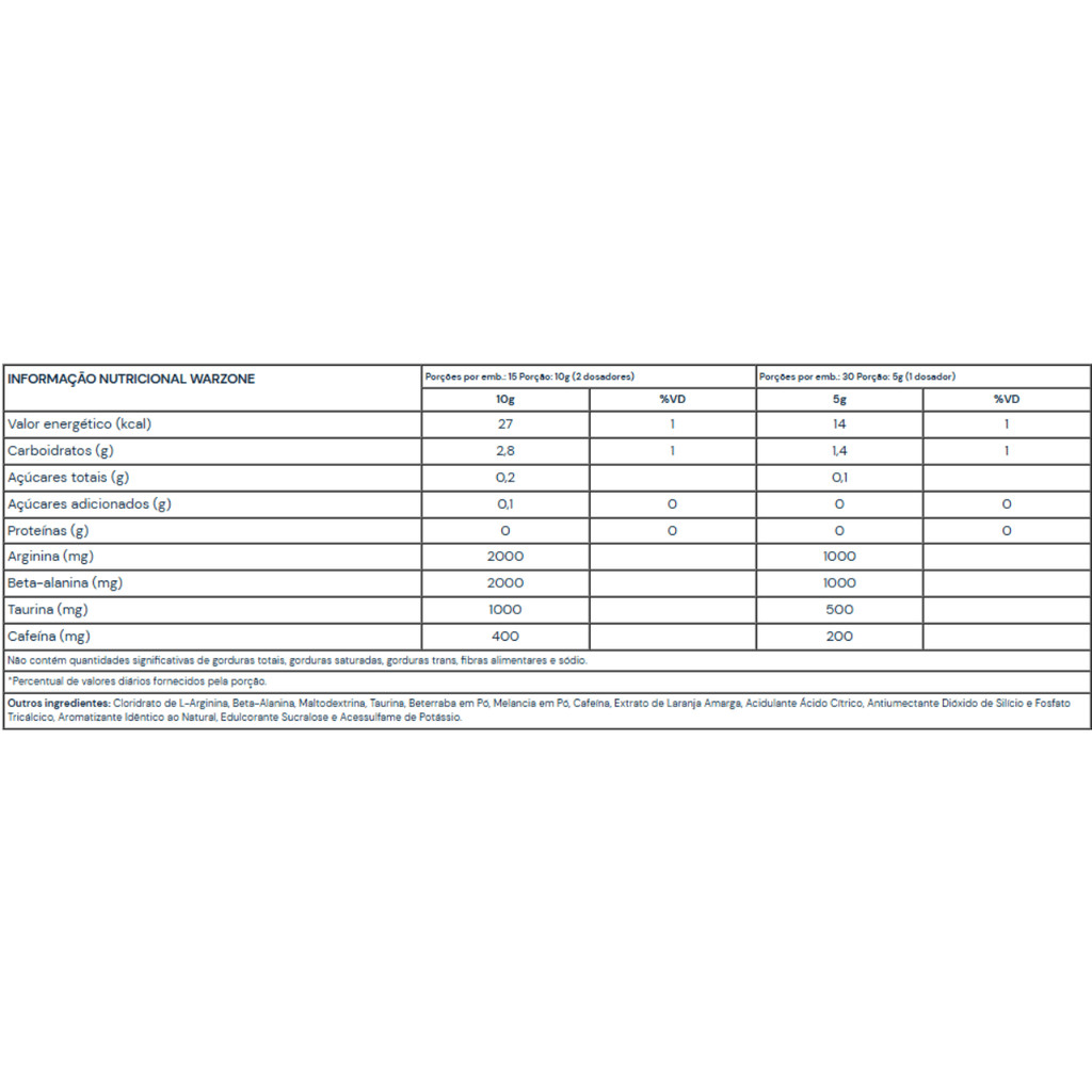 Sobre o produto: Warzone Blood Battle da Under Labz é um pré-treino de alto desempenho desenvolvido para atletas e praticantes de atividades físicas que buscam máximo foco, força e resistência durante os treinos. Com uma fórmula concentrada e potente, o produto combina ingredientes estimulantes e vasodilatadores que promovem energia intensa, melhora no desempenho físico e maior vascularização muscular. Ideal para treinos de alta intensidade, Warzone Blood Battle proporciona uma experiência extrema, com rápida absorção e ação prolongada. Como consumir - Recomenda-se diluir 1 scoop (5g) de Warzone Blood Battle em 200 ml de água gelada, cerca de 20 a 30 minutos antes do treino. - Não exceder a dose recomendada. - Avaliar a tolerância iniciando com meia dose. Benefícios - Aumento significativo de energia e disposição - Melhora da força e resistência muscular - Aumento da vascularização e do pump muscular - Melhora do foco e da concentração durante os treinos - Estímulo do metabolismo e da queima calórica - Auxílio no desempenho de treinos de alta intensidade Alergênicos: Pode conter traços de leite, soja, ovo e derivados, devido ao processamento em equipamentos que manipulam esses ingredientes. Ingredientes: Cafeína anidra, taurina, beta-alanina, arginina alfa-cetoglutarato (AAKG), citrulina malato, creatina monohidratada, L-tirosina, inositol, maltodextrina, aroma idêntico ao natural, acidulante ácido cítrico, edulcorante sucralose e corante artificial. Advertências - Produto indicado para maiores de 19 anos. - Não deve ser consumido por gestantes, lactantes, crianças ou pessoas com sensibilidade à cafeína. - Consulte um médico ou nutricionista antes de iniciar o uso, especialmente se possuir alguma condição de saúde. - Não ultrapassar a dose diária recomendada. - Manter fora do alcance de crianças. - Conservar em local seco, fresco e ao abrigo da luz. Conclusão: Warzone 150g Blood Battle da Under Labz é a escolha ideal para quem busca um pré-treino potente, com ingredientes selecionados para garantir máxima performance física e mental. Desenvolvido para atletas exigentes, este suplemento proporciona energia explosiva, foco total e força intensa para levar seus treinos ao próximo nível. Use com responsabilidade e prepare-se para a verdadeira batalha nos treinos.