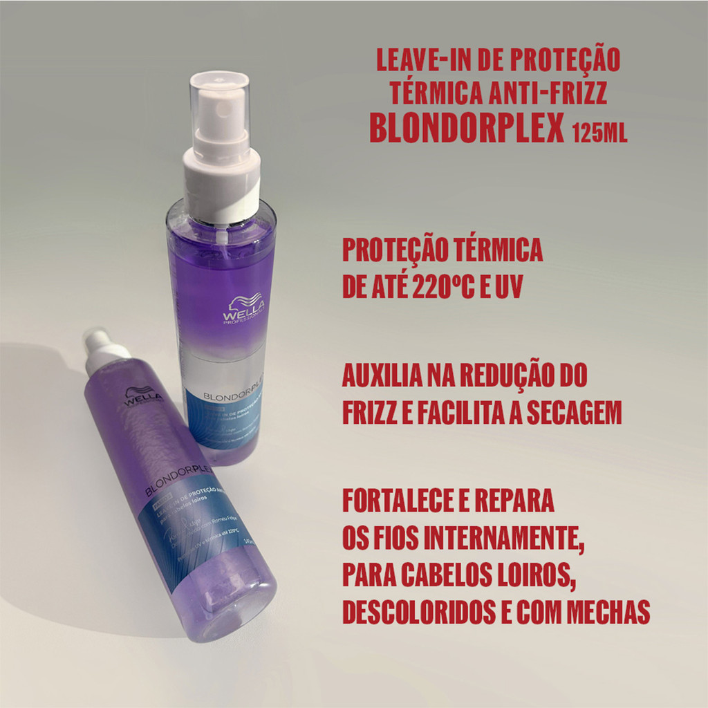 Wella Professionals BlondorPlex - Proteção Térmica e Brilho Ideal para cabelos loiros danificados, descoloridos ou com mechas. O leave-in bifásico protege contra calor de até 220°C, raios solares e frizz, criando uma barreira invisível nos fios. Sua fórmula avançada mantém o alinhamento, a maciez e o brilho intenso dos cabelos loiros, prolongando a saúde da fibra capilar mesmo após o uso de fontes de calor. Conselho de Aplicação Agite antes de usar. Aplique diretamente nos fios úmidos. Não enxágue.