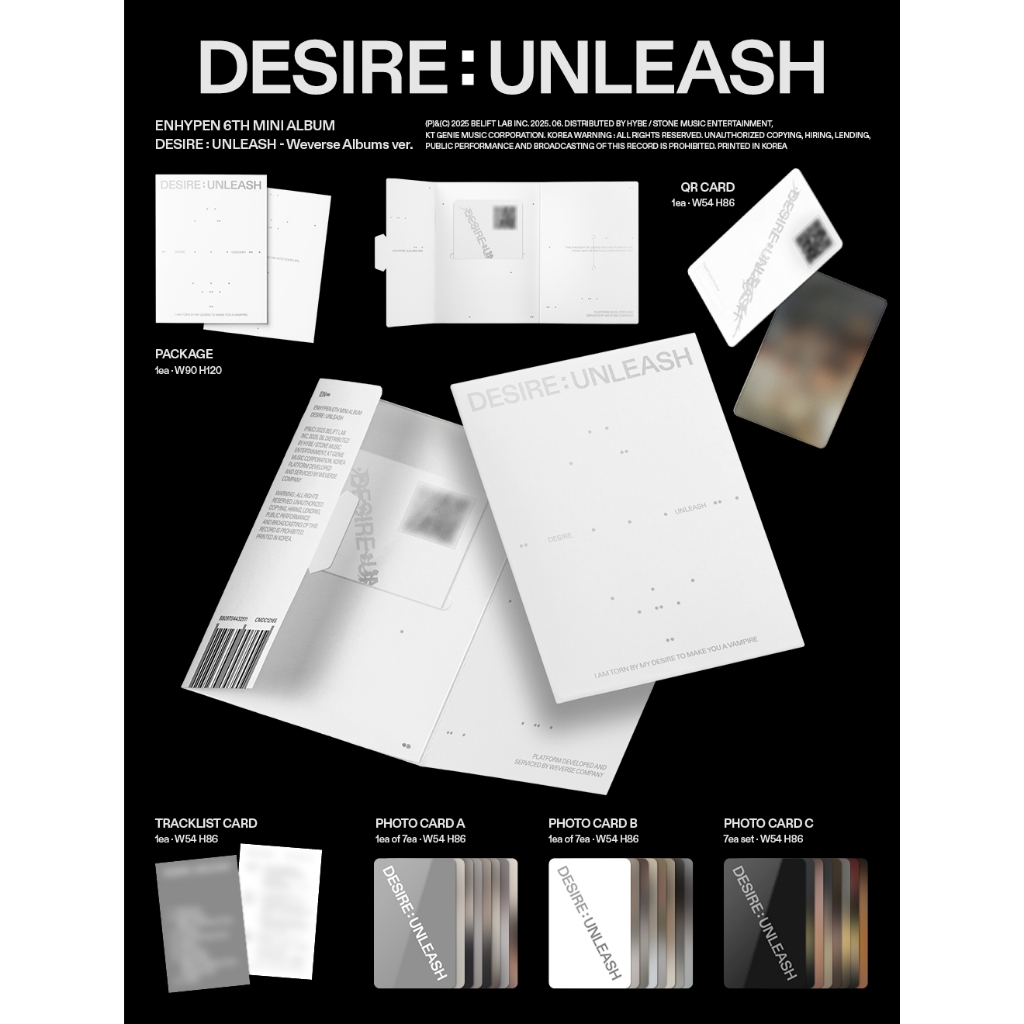 [Weverse Albums ver.] ENHYPEN - 6th Mini Album [DESIRE : UNLEASH] ❤ This product is sent directly to customers from Korea. ❤ We guarantee this is 100% original Korea product. ◼ Description: 🎁 [Weverse Albums ver.] ENHYPEN - 6th Mini Album [DESIRE : UNLEASH] 📅 Release Date : June 5, 2025 🎁 Contents - PACKAGE : 1ea / 90x120mm - QR CARD : 1ea / 54x86mm - TRACKLIST CARD : 1ea / 54x86mm - PHOTO CARD A : 1ea of 7ea / 54x86mm - PHOTO CARD B : 1ea of 7ea / 54x86mm - PHOTO CARD C : 7ea set / 54x86mm ◼ The out box is intended to protect the inner product, so we are not responsible for some dents or damage caused by shipping. ◼ Since we can't check the contents of the sealed product, we are not responsible for any missing or dented parts inside. Some scratches that occur during the manufacturing process are natural and not defective, so we are not responsible for them.