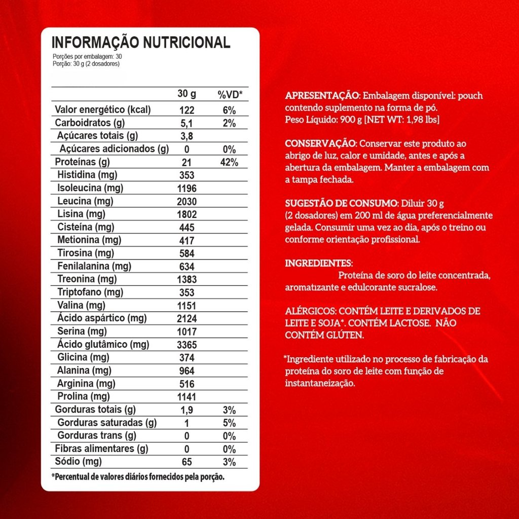 Whey 100% Pure Refil 900g Integralmédica + Vitamina B12 30 Cápsulas WeFit Sobre o produto: Essa combinação reúne dois suplementos fundamentais para o desempenho físico e o bem-estar geral. O Whey 100% Pure Integralmédica, na versão refil de 900g, é uma proteína concentrada do soro do leite, ideal para quem busca ganho de massa muscular, recuperação pós-treino e suporte nutricional diário. Já a Vitamina B12 WeFit, com 30 cápsulas, atua no metabolismo energético, na prevenção da anemia e na proteção do sistema nervoso. Juntos, formam um combo prático, funcional e altamente eficaz. Como consumir: Whey 100% Pure Integralmédica: Diluir 2 scoops (aproximadamente 30g) em 200 ml de água gelada ou bebida de sua preferência. Consumir de 1 a 2 vezes ao dia, ou conforme orientação de médico ou nutricionista. Ideal após o treino e/ou entre as refeições. Vitamina B12 WeFit: Consumir 1 cápsula ao dia, com água, preferencialmente em jejum ou conforme orientação profissional. Benefícios: Whey 100% Pure Integralmédica: • Alto teor de proteínas de alto valor biológico • Auxilia no ganho e manutenção de massa muscular • Favorece a recuperação muscular pós-exercício • Rápida absorção e excelente digestibilidade • Ideal para atletas, praticantes de atividade física e pessoas com dietas proteicas Vitamina B12 WeFit: • Previne a anemia megaloblástica • Contribui para a saúde do sistema nervoso • Aumenta a energia e reduz o cansaço • Auxilia na formação das células sanguíneas • Fórmula sem glúten, sem conservantes, zero gordura e açúcar Alergênicos: Whey 100% Pure: • Contém derivados de leite e soja • Pode conter traços de ovo • Contém lactose • Contém glúten Vitamina B12: • Pode conter derivados de leite, soja, ovos e amendoim • Não contém glúten Ingredientes: Whey 100% Pure Integralmédica: Proteína concentrada do soro do leite (WPC), aromatizantes, espessante goma xantana, antiumectante dióxido de silício, edulcorante sucralose, emulsificante lecitina de soja. Vitamina B12 WeFit: Cianocobalamina (Vitamina B12), agente de massa: amido, antiumectante: dióxido de silício. Composição da cápsula: gelatina e corante dióxido de titânio. Advertências: • Suplementos alimentares não substituem uma alimentação equilibrada • Mantenha fora do alcance de crianças • Não exceder a dose diária recomendada • Produto indicado para maiores de 19 anos • Gestantes, lactantes e pessoas com condições de saúde devem consultar um médico antes do consumo • Armazenar em local seco, fresco e ao abrigo da luz • Após aberto, consumir a Vitamina B12 em até 60 dias Conclusão: O combo Whey 100% Pure Integralmédica + Vitamina B12 WeFit oferece suporte completo para quem busca força, desempenho, recuperação muscular e mais disposição no dia a dia. Com alta qualidade nutricional, essa dupla é ideal para treinos mais eficazes e uma rotina com mais energia e saúde.