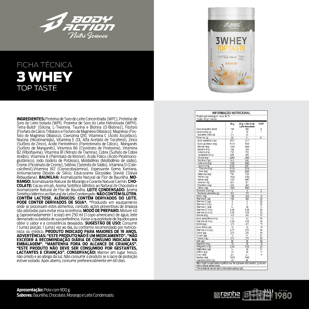 3 WHEY TOP TASTE INGREDIENTES: Proteína de Soro do Leite Concentrada (WPC), Proteína de Soro do Leite Isola-da (WPI), Proteína de Soro do Leite Hidrolisada (WPH), Tetra-Build® [Glicina, L-Treonina, Taurina e Biotina (D-Biotina)], Fósforo [Fosfato de Cálcio Tribásico e Fosfato de Magnésio Dibásico], Magné-sio (Fosfato de Magnésio Dibásico), Coenzima Q10, Vitamina C (Ácido Ascórbico), Niacina (Nico-tinamida), Vitamina E (DL Alfa Acetato de Tocoferol), Zinco (Sulfato de Zinco), Ácido Pantotênico (Pantotenato de Cálcio), Manganês (Sulfato de Manganês), Vitamina B6 (Cloridrato de Piridoxina), Vitamina B2 (Riboflavina), Vitamina B1 (Nitrato de Tiamina), Cobre (Sulfato de Cobre Anidro), Vi-tamina A (Palmitato de Retinol), Ácido Fólico (Ácido Piroilmonoglutâmico), Iodo (Iodeto de Potás-sio), Molibdênio (Molibdênio de sódio), Cromo (Picolinato de Cromo), Selênio (Selenito de Sódio), Vitamina D (Colecalciferol),Vitamina B12 (Cianocobalamina), Aromatizante Natural de Flor de Baunilha, Espessante Goma Xantana, Antiumectante Dióxido de Silício e Edulcorante Glicosídeo Steviól (Stévia Rebaudiana). NÃO CONTÉM GLÚTEN. CONTÉM LACTOSE. ALÉRGICOS: CONTÉM DERIVADOS DO LEITE. PODE CONTER DERIVADOS DE SOJA*. *Produzido em equipamento onde se processam estes alimentos, contudo, ações preventivas de limpeza são ado-tadas para evitar essa ocorrência. MODO DE PREPARO: Misture 40g (aproximadamente 1 scoop) em 250ml (1 copo americano) de água, leite desnatado ou bebida de sua preferência. Variar a quantidade de líquidos para obter o sabor e a consistência desejados. SUGESTÃO DE USO: Consumir 1 (uma) porção 1 (uma) vez ao dia, ou conforme recomendado por nutricionista ou médico. PRODUTO INDICADO PARA MAIORES DE 19 ANOS. ADVERTÊNCIAS: “ESTE PRODUTO NÃO É UM MEDICAMENTO.” “NÃO EXCEDER A RE-COMENDAÇÃO DIÁRIA DE CONSUMO INDICADA NA EMBALAGEM.” “MANTENHA FORA DO ALCANCE DE CRIANÇAS.” “ESTE PRODUTO NÃO DEVE SER CONSUMIDO POR GESTANTES, LACTANTES E CRIANÇAS.” CONSERVAÇÃO: Manter em lugar fresco, não úmido e ao abrigo da luz. Não consumir o produto se o lacre de proteção estiver violado. Após aberto, consumir preferencialmente em 60 dias. _______________________________________ Uma nutrição equilibrada tem um papel muito importante na qualidade de vida. Com o ritmo acelerado de muitas pessoas, às vezes, é muito difícil prestar atenção a todos os requisitos que o corpo precisa para estar saudável e forte. Neste sentido, os suplementos cumprem a função de complementar a alimentação e ajudam a obter as vitaminas, minerais, proteínas e outros componentes indispensáveis para o correto funcionamento do organismo. *Este produto é um suplemento dietético, não é um medicamento. Suplementa Ante dietas insuficientes. Consulte seu médico e / ou farmacêutico.