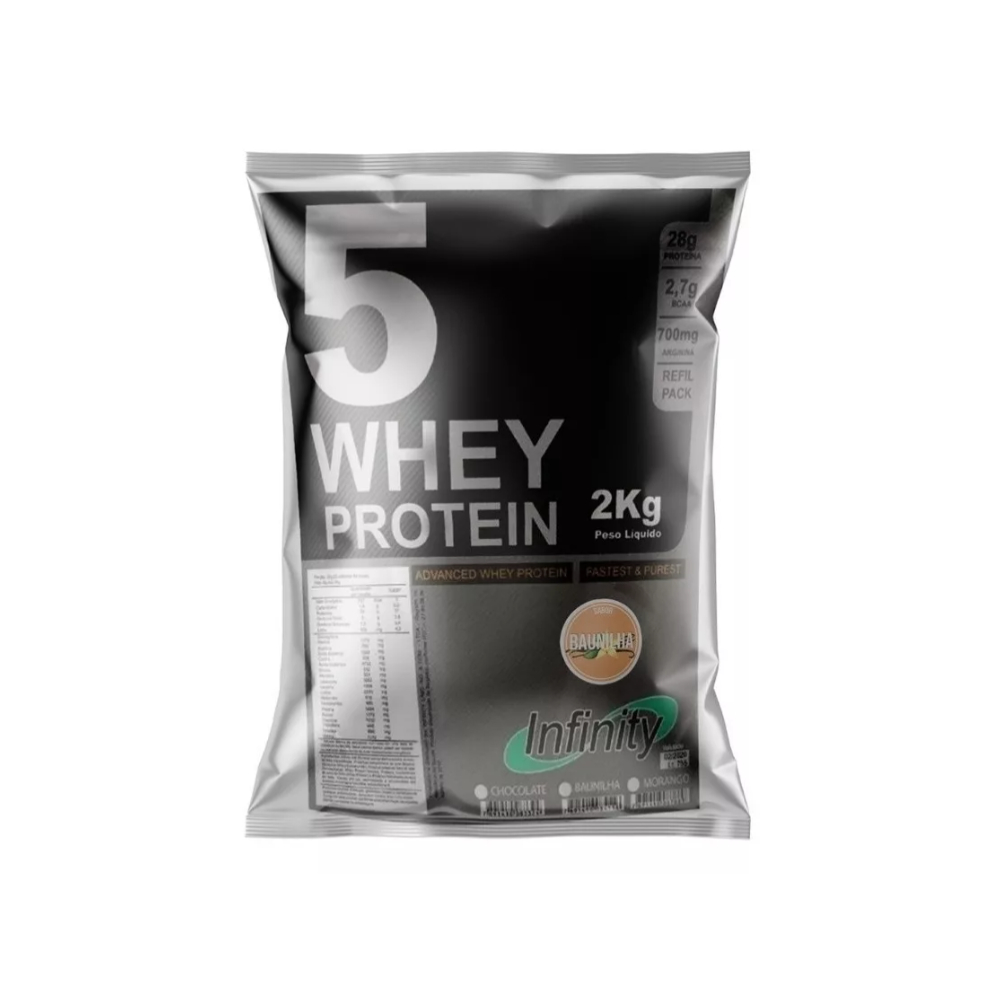 Whey 5w (contem Proteína Isolada) 2kg - Infinity Labs Wey 5 Whey Protein 2kg é ideal para auxiliar no aporte de atletas. Whey Protein surgiu como fruto de pesquisa intensa na área de nutrição esportiva. Sua fórmula 5w foi especialmente elaborada com 5 diferentes tipos de proteínas do soro do leite (whey protein), de alta concentração, absorção e biodisponibilidade. São elas: Microfiltered Whey Protein Isolate: (Proteína Isolada do soro do Leite Microfiltrada): possui tecnologia cross-flow de microfiltração, resultado de várias técnicas de filtração por membrana cerâmica. Contém glicomacropeptídeo (GMP) e menor teor de gordura e lactose. É de fácil digestão. Bioactiva Whey Concentrate (Proteína Concentrada do Soro Bioativa): obtida por um seletivo de transferência por membranas, Bioactive Whey Concentrate possui componentes bioativos que otimizam a recuperação do tecido muscular, a regeneração celular e os fatores de crescimento: IGF1, TGF-B1 E TGF-B2, além de todos os aminoácidos essenciais. Íon - Exchange Whey Protein Isolate (Proteína Isolada do Soro do Leite): É produzida a partir de uma reação química denominada troca iônica, que dá ao produto o mais concentrado teor de proteínas de AVB (93%). Tem baixíssimo teor de gordura e zero de carboidratos (lactose free). Whey Protein Hydrolysed (Proteína do Soro do Leite Hidrolisada): É obtida a partir de um processo de hidrólise enzimática, conferindo rápida disponibilidade para o atleta ao adicionar aminoácidos aos músculos. Whey Protein Concentrate (Proteína Concentrada do Soro do leite): A clássica e nobre Whey Protein, concentrada a partir do soro do leite proveniente da fabricação de queijo, na forma instantânea. A cada dose de 35g de 5 Whey Protein contem: 28g de proteina; 2,7g BCAA; 700mg de Arginina Não contém soja. Adicionar 3 colheres de sopa (em média 35g) de 5 Whey Protein à 200ml de água e misturar. Preparo instantâneo. Experimente também com leite desnatado, frutas ou com sua bebida preferida. Tome 1 a 2 porções de 5 Whey Protein ao dia, ou conforme orientação de um Nutricionista Sabores: Baunilha, Chocolate e Morango ANVISA: Registro ISENTO conforme resolução RDC 27 de 06 de agosto de 2010 anexo I.