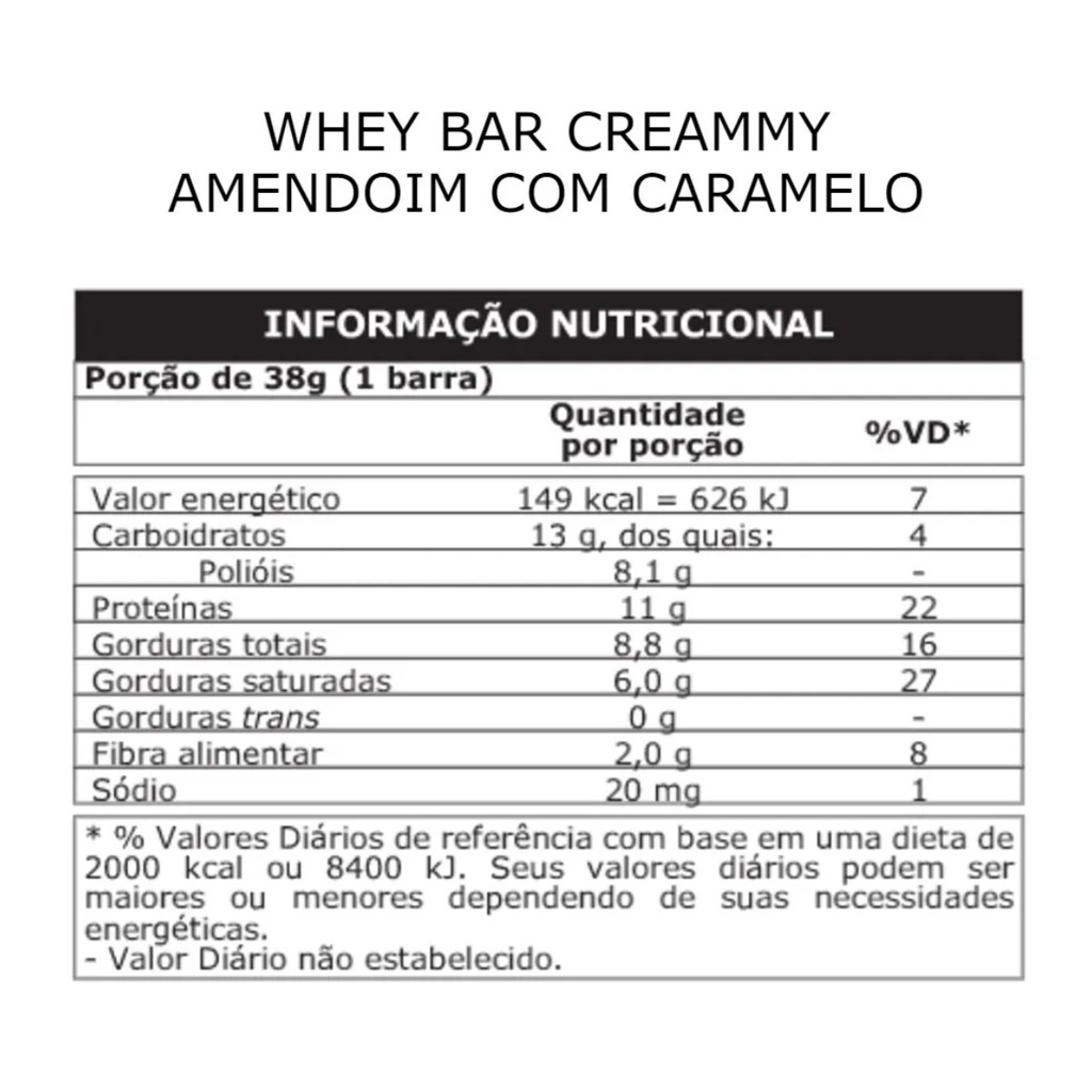 Whey Bar Creamy: Sabor, Praticidade e Proteína para o Seu Dia a Dia A pioneira Whey Bar agora chega em uma versão irresistivelmente cremosa, oferecendo uma experiência única de sabor e nutrição. Com 11g de proteína por barra, ela é perfeita para quem busca praticidade e qualidade em qualquer momento do dia. Disponível em diversos sabores, como Amendoim com Caramelo, Chocolate, Coco, Cookies e Cream, e Morango, a Whey Bar Creamy combina um delicioso recheio cremoso com cobertura de chocolate ao leite zero açúcar, ideal para quem não abre mão de sabor e benefícios. Benefícios: 11g de proteína por barra, auxiliando na formação e manutenção muscular. Recheio cremoso e sem adição de açúcar, proporcionando uma textura e sabor incrivelmente satisfatórios. Prática, ideal para o consumo entre as refeições e fácil de levar para qualquer lugar. Ingredientes Principais: Proteína concentrada do soro do leite e caseinato de cálcio, essenciais para o aumento de massa muscular. Colágeno hidrolisado, importante para a saúde das articulações e pele. Óleo de girassol e farinha de amendoim para garantir um toque nutritivo e energético. Edulcorantes como xarope de maltitol e glicosídeos de esteviol, que proporcionam o sabor doce sem adição de açúcares. Recomendação de uso: Consumir entre as refeições para um aporte proteico a qualquer hora do dia. Importante: Este produto contém glúten e derivados de leite, soja e amendoim. Pode conter vestígios de outros alérgenos, como trigo, castanhas e outros. Consulte as recomendações de consumo e mantenha fora do alcance de crianças. Com Whey Bar Creamy, você garante uma dose de proteína com sabor incrível e sem culpa