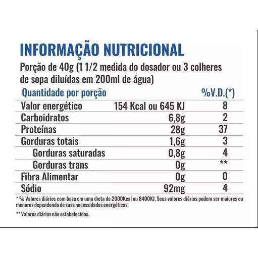 O Whey Protein (WP) apresenta alto valor biológico, devido às altas concentrações proteicas, e presença de compostos bioativos, por isso, atualmente é considerado um alimento funcional. A suplementação com WP demonstra efeitos benéficos em estratégias de emagrecimento, aumento da saciedade, ação antioxidante, aumento da síntese proteica e contribui de forma positiva para a saúde. Principais destaques sobre a Proteína Concentrada do Soro do Leite ( Whey Protein Concentrate ) A WPC apresenta maior concentração de cálcio, maior aceitação em termos de palatabilidade, e ainda, possui um ótimo aporte proteico. Ainda, é uma proteína com alto valor biológico, apresentando todos os aminoácidos essenciais, ou seja, aqueles que nosso organismo não produz e que precisam ser ingeridos via alimentação e/ou suplementação. Indicações de Uso da 100% Premium Whey *São várias as situações em que a proteína do soro do leite pode ser utilizada: *Pensando em Saúde, o consumo de proteínas está associado com melhora da função vascular e endotelial, e, também, redução de fatores de risco lipídico; *Podemos associar o consumo proteico à Saciedade e Controle de Apetite, quando combinados à ingestão de fibras e carboidratos de baixo índice glicêmico; *Ação em prevenção, manutenção e aumento de massa muscular. O consumo adequado de proteínas ao longo do dia impacta positivamente na composição corporal muscular; *Consumo proteico antes de dormir também pode impactar positivamente no aumento de massa muscular, diminuindo o catabolismo do período de jejum. Como tomar Whey Protein ? Não há um horário específico para o consumo de Whey Protein. Isso dependerá do objetivo, rotina de treinamentos, do consumo alimentar e da individualidade de cada. De acordo com estudos mais recentes, orienta-se que o consumo proteico seja distribuído entre as refeições ao longo do dia (0,3 g de proteína por kg de peso). Assim, o Whey pode ser consumido como parte de um lanche, como pós treino – para otimizar a recuperação muscular e síntese proteica - e até mesmo na refeição antes de dormir (até 0,6 g proteína por kg de peso), o que também favorece o turnover proteico e síntese proteica muscular. Existe contraindicação para o uso de Whey protein ? De modo geral, a proteína Concentrada do soro do leite (ou WPC) contém lactose e, por isso, não é indicada para intolerantes a este carboidrato. É contraindicado também, para indivíduos com alergia à proteína do leite de vaca. Diante de alguma situação clínica específica, procure sempre um profissional capacitado para melhor orientá-lo quanto as suas necessidades! Destaques do Produto 100% Premium Whey - 28g Proteína por Dose; - 6g BCAA’S; - 600mg Arginina; - 5g Glutamina; - Auxilia no pump muscular devido a arginina; - Sem adição de açúcares; Não contém carboidrato adicionado à formulação; Fácil diluição; Excelente palatabilidade; Não contém Glúten; Ingredientes: Concentrado proteico do soro de leite (WPC), aroma sintético idêntico ao natural de baunilha, aroma sintético idêntico ao natural, carboximetilcelulose (espessantes) e sucralose (edulcorante). ""ALÉRGICOS: CONTÉM DERIVADOS DO LEITE E DA SOJA*."" *Ingrediente usado no processo de instantaneização da proteína do soro do leite. Sugestão de uso: Adicione 40 g do produto (1 ½ medidas do dosador ou 3 colheres de sopa) em 200 ml de leite ou água, no liquidificador ou coqueteleira, bater no mínimo 5 segundos. Consumir de 2 a 3 vezes ao dia, sendo uma delas logo após o exercício físico. " CONSERVAÇÃO E ADVERTÊNCIAS: Conservar o produto em local fresco e seco ao abrigo de raios solares. Após aberto consumir preferencialmente em até 30 dias. Crianças, gestantes, idosos e portadores de quaisquer enfermidades devem consultar o médico e/ou nutricionista. Este produto não substitui uma alimentação equilibrada e seu consumo deve ser orientado por nutricionista ou médico.