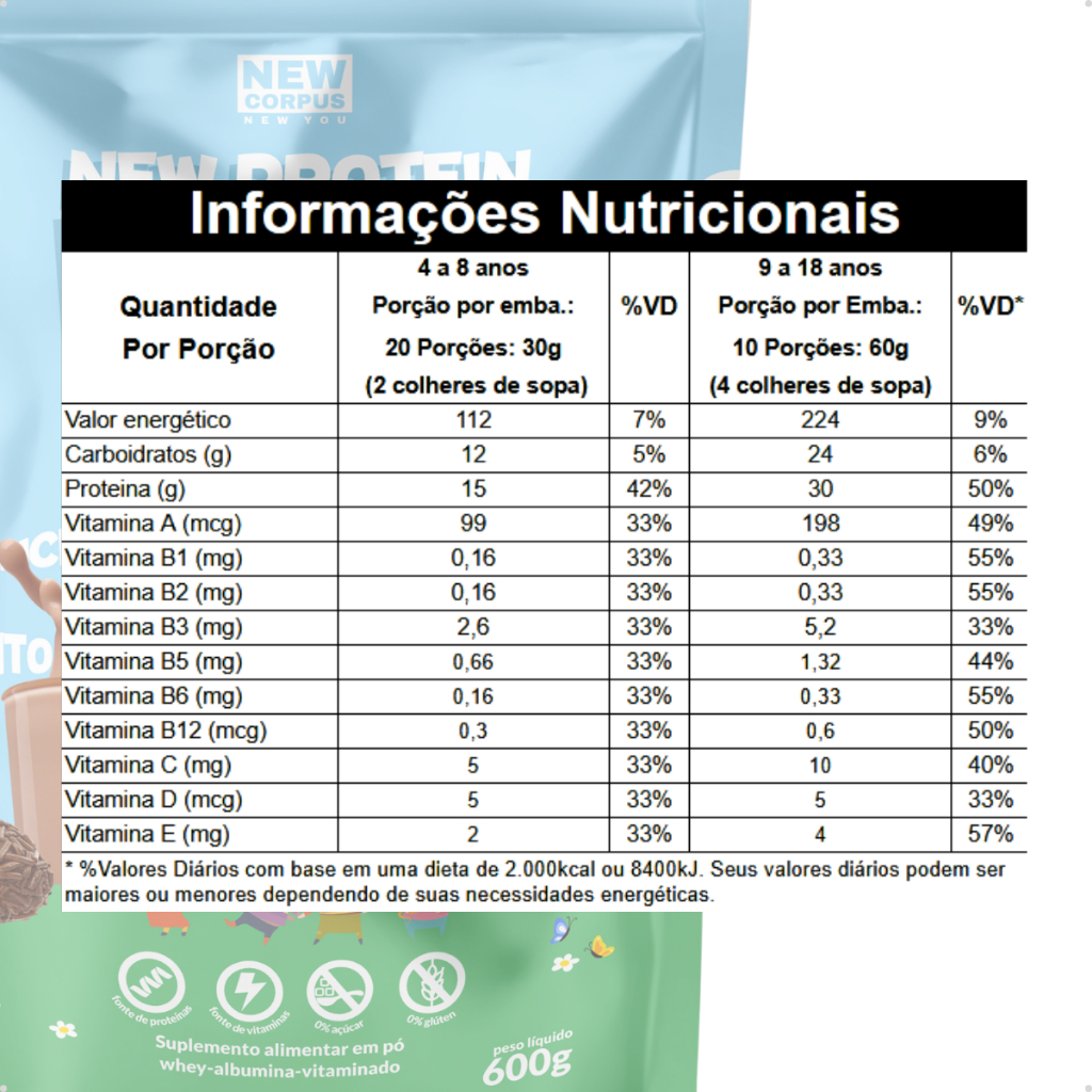NEW PROTEIN KIDS - Suplemento Alimentar Infantil | Sabor Milkshake de Brigadeiro | 600g O New Protein Kids da New Corpus é um suplemento alimentar em pó, desenvolvido especialmente para crianças, com o objetivo de auxiliar no desenvolvimento saudável, fortalecer a imunidade e complementar a alimentação com proteínas, vitaminas e minerais. Destaques do Produto: Sabor delicioso de milkshake de brigadeiro -Fonte de proteínas para crianças -Fortalece o sistema imunológico -Enriquecido com 12 vitaminas essenciais -Sem glúten -Ideal para dietas com restrição alimentar Suave, cremoso e fácil de preparar Recomendação de Uso: De 4 a 8 anos: Tomar 2 colheres de sopa (30g), 1 vez ao dia, diluídas em 150ml a 200ml de água ou leite. De 9 a 18 anos: Tomar 2 colheres de sopa (30g), 2 vezes ao dia, diluídas em 150ml a 200ml de água ou leite. Preferencialmente uma dose no café da manhã e outra no lanche da tarde. Informações Nutricionais (por porção de 30g): Proteínas: 15g Carboidratos: 12g Rico em Vitaminas A, B1, B2, B3, B5, B6, B12, C, D, E, Ácido Fólico e mais Energia: 112 kcal Ingredientes: Proteína concentrada do soro do leite, albumina, maltodextrina, cacau em pó, chocolate granulado, vitaminas A, B1, B2, B3, B5, B6, B12, C, D e E, espessante CMC, entre outros. Conservação: Manter o produto em local fresco, seco e protegido da luz. Após aberto, consumir em até 30 dias. Não utilizar se o lacre estiver violado. Advertências: Este produto não é um medicamento. Não exceder a recomendação diária de consumo indicada na embalagem. Manter fora do alcance de crianças. Contém lactose. Produto dispensado de registro conforme RDC 240/2018. Compromisso New Corpus: Criado com o compromisso de oferecer uma nutrição segura e saborosa, o New Protein Kids foi desenvolvido pensando nas crianças que têm seletividade alimentar. É um shake proteico vitaminado, que une sabor e nutrição em um só produto. Peso Líquido: 600g Importado dos EUA | Fabricado com Whey Protein de Alta Qualidade