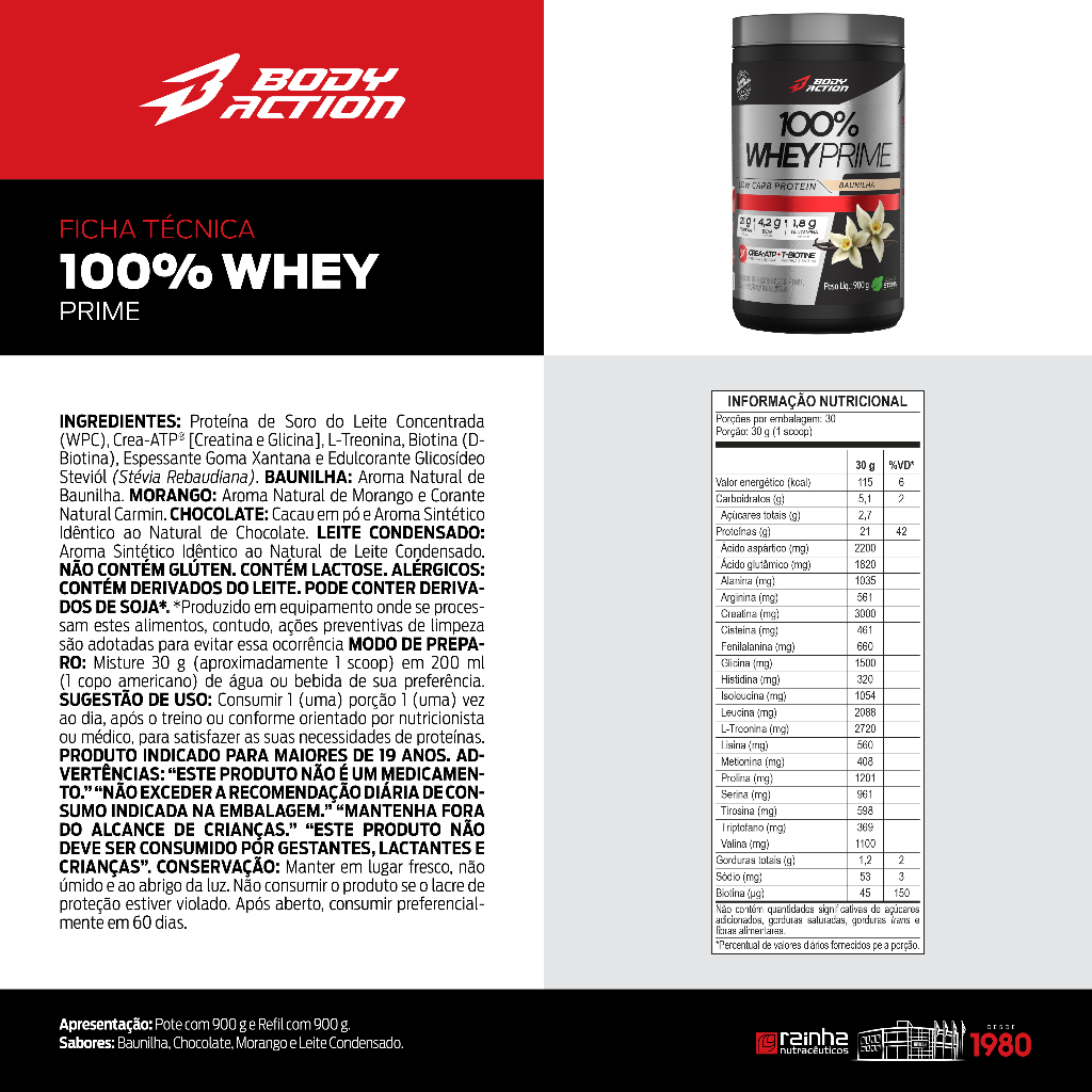 100% WHEY PRIME WHEY PROTEIN: As proteínas são fundamentais para o crescimento muscular, pois estimulam a síntese proteica e evitam o catabolismo dos músculos. O Whey Protein, é uma excelente estratégia nutricional para que o atleta atinja a ingestão proteica adequada, fazendo com que haja recuperação, crescimento e força muscular. Além disso, o Whey protein fornece proteínas e aminoácidos de alto valor biológico com rápida absorção e alta digestibilidade. INGREDIENTES: Proteína de Soro do Leite Concentrada (WPC), Crea-ATP® [Creatina e Glicina], L-Treonina, Biotina (D-Biotina), Aroma Natural de Baunilha, Espessante Goma Xantana e Edulco-rante Glicosídeo Steviól (Stévia Rebaudiana). NÃO CONTÉM GLÚTEN. CONTÉM LACTOSE. ALÉRGICOS: CONTÉM DERIVADOS DO LEITE. PODE CONTER DERIVADOS DE SOJA*. *Produzido em equipamento onde se processam estes alimentos, contudo, ações preventivas de limpeza são adotadas para evitar essa ocorrência. (Baunilha) MODO DE PREPARO: Misture 30g ( aproximadamente 1 scoop) em 200ml (1 copo americano) de água ou bebida de sua preferência. MODO DE PREPARO DIDÁTICO: 1. Misture 1 scoop (30g) em 200ml de água ou bebida de sua preferência. 2.Variar, se preferível, a quantidade de líquido para obter sabor e consistência desejada. 3.Dica: Utilize uma coqueteleira para facilitar a diluição de proteína. 4.Deixe sua proteína mais nutritiva e gostosa adicionando chia, aveia, frutas, açaí ou pasta de amendoim. SUGESTÃO DE USO: Consumir 1 (uma) porção 1 (uma) vez ao dia, após o treino ou conforme orientado por nutricionista ou médico, para satisfazer as suas necessidades de proteínas. PRODU-TO INDICADO PARA MAIORES DE 19 ANOS. ADVERTÊNCIAS: “ESTE PRODUTO NÃO É UM MEDICAMENTO.” “NÃO EXCEDER A RE-COMENDAÇÃO DIÁRIA DE CONSUMO INDICADA NA EMBALAGEM.” “MANTENHA FORA DO ALCANCE DE CRIANÇAS.” “ESTE PRODUTO NÃO DEVE SER CONSUMIDO POR GESTANTES, LACTANTES E CRIANÇAS”. CONSERVAÇÃO: Manter em lugar fresco, não úmido e ao abrigo da luz. Não consumir o produto se a embalagem de proteção estiver violada. Após aberto, consumir preferencialmente em 60 dias.