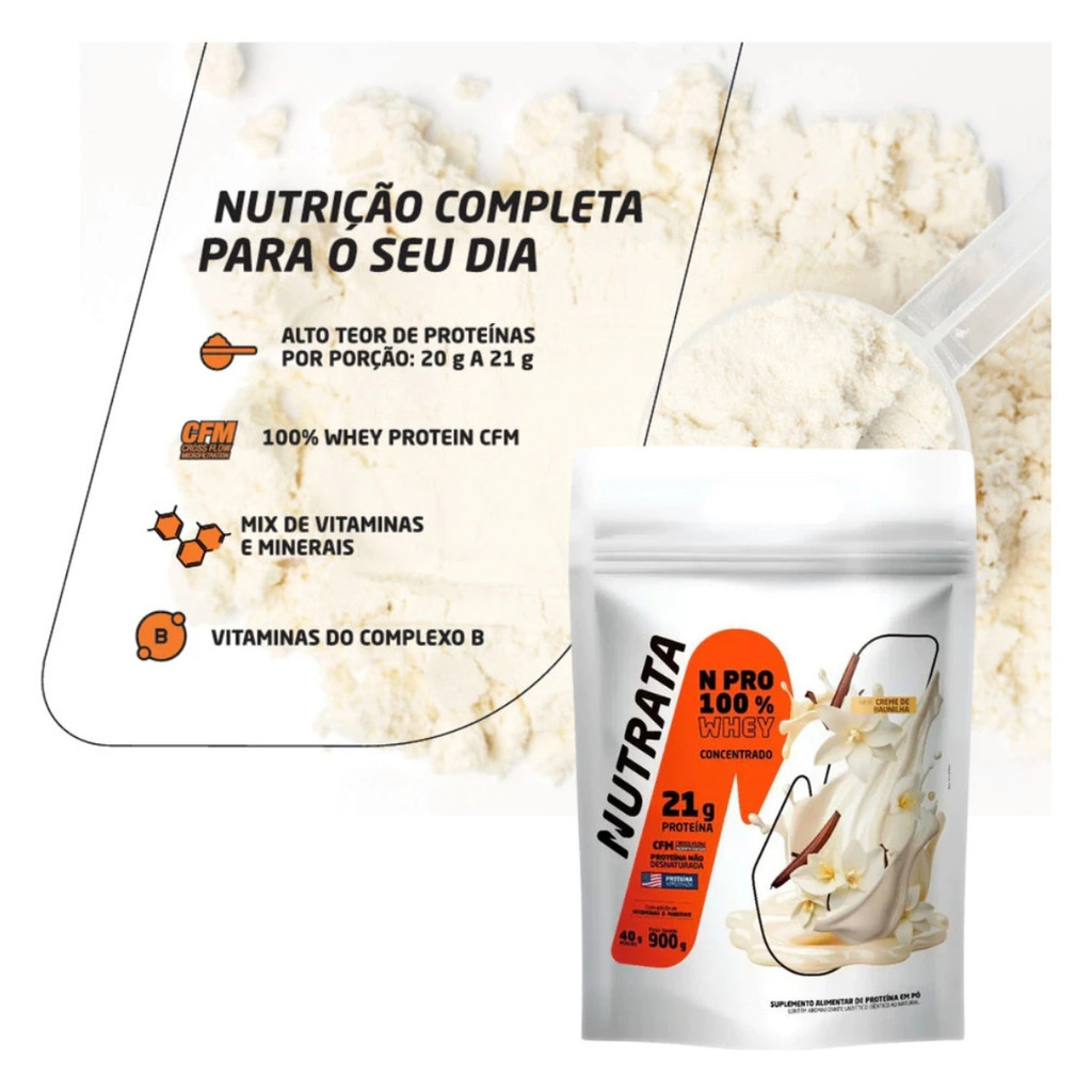 Whey Protein 100% NPRO Nutrata – Refil 900g Sabor Baunilha Sobre o produto: O Whey Protein 100% NPRO da Nutrata é um suplemento proteico em pó formulado com proteína do soro do leite obtida por tecnologia CFM (Cross Flow Microfiltration), que preserva a qualidade e a integridade das proteínas. Sua fórmula também contém um mix de vitaminas, incluindo o complexo B, e minerais, oferecendo suporte nutricional adicional. É ideal para quem busca complementar a ingestão diária de proteínas de forma prática, saborosa e de alta qualidade. Como consumir: - Diluir 40 g (3 colheres dosadoras) em 200 ml de água ou leite. - Consumir até 2 porções ao dia, conforme a necessidade individual ou orientação de nutricionista. - Pode ser utilizado como pós-treino, lanche, ceia ou adicionado em receitas para enriquecimento nutricional. Benefícios: - Fonte de 100% whey protein de alta qualidade - Proteínas preservadas por tecnologia CFM (Cross Flow Microfiltration) - Contribui para complementar a ingestão diária de proteínas - Suporte nutricional com vitaminas (incluindo complexo B) e minerais - Pode ser consumido como pós-treino, lanche ou ceia - Sabor agradável de baunilha, fácil de preparar - Ajuda na manutenção e recuperação muscular Alergênicos: Contém lactose e derivados do leite Ingredientes: Proteína do soro do leite (whey protein), vitaminas e minerais (complexo B, entre outros), aromatizante idêntico ao natural de baunilha e edulcorante sucralose. Advertências: - Produto destinado a uso adulto. - Não exceder a recomendação diária de consumo indicada na embalagem. - Não substitui uma alimentação equilibrada. - Manter fora do alcance de crianças e animais. - Gestantes, lactantes, pessoas com condições de saúde ou alergias específicas devem consultar nutricionista ou médico antes do consumo. Conclusão: O Whey Protein 100% NPRO Nutrata – Sabor Baunilha é uma opção prática e confiável para complementar a ingestão diária de proteínas, oferecendo qualidade superior, sabor agradável e suporte nutricional completo. Ideal para quem busca desempenho, recuperação muscular e facilidade de consumo no dia a dia.