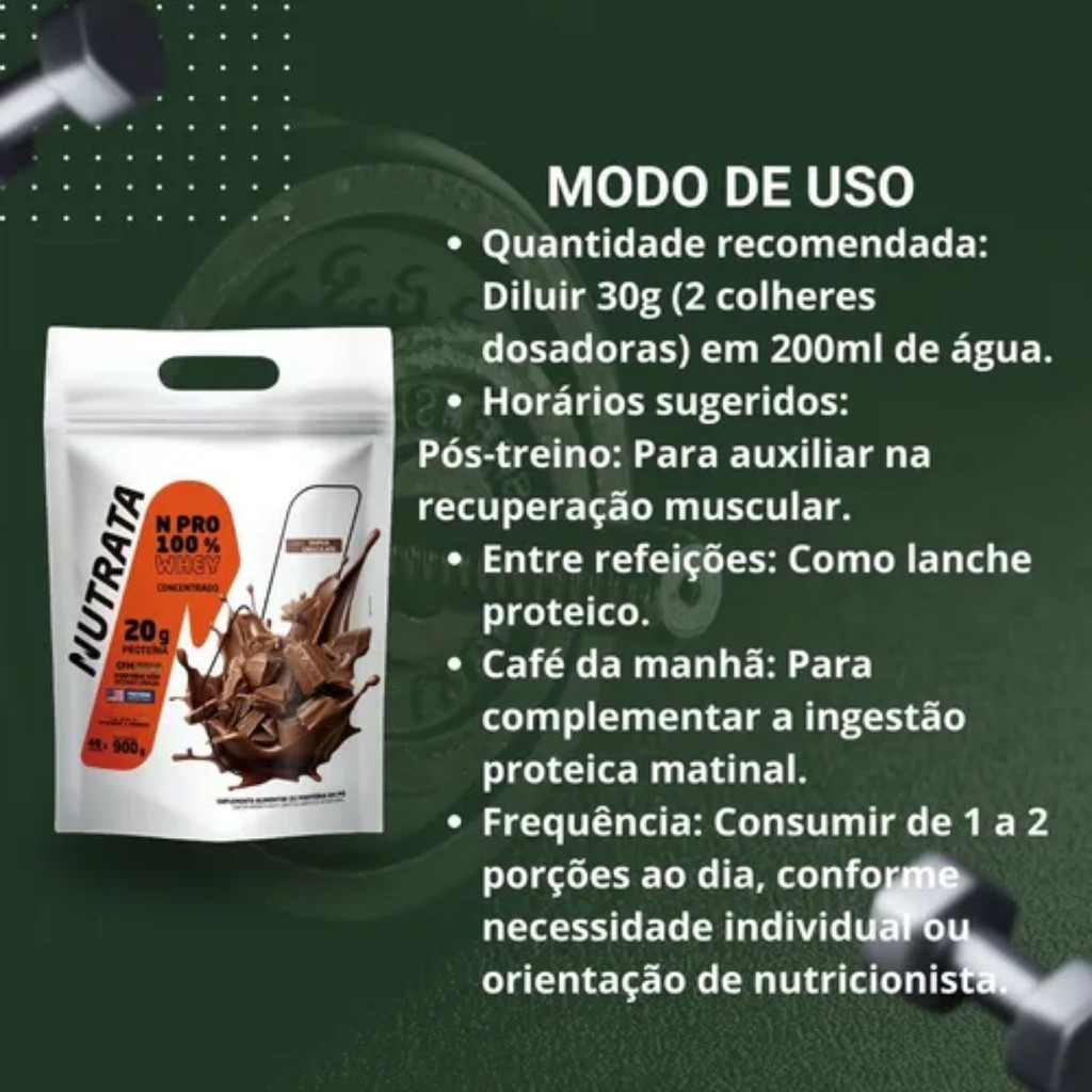 Whey Protein 100% NPRO Nutrata – Refil 900g Sabor Chocolate Sobre o produto: O Whey Protein 100% NPRO da Nutrata é um suplemento proteico em pó formulado com proteína do soro do leite obtida por tecnologia CFM (Cross Flow Microfiltration), que garante a preservação da qualidade e integridade das proteínas. A fórmula ainda contém um mix de vitaminas, incluindo o complexo B, e minerais, oferecendo suporte nutricional adicional. Ideal para quem deseja complementar a ingestão diária de proteínas com praticidade, sabor delicioso e alta qualidade. Como consumir: - Diluir 40 g (3 colheres dosadoras) em 200 ml de água ou leite. - Consumir até 2 porções ao dia, conforme a necessidade individual ou orientação de nutricionista. - Pode ser consumido como pós-treino, lanche, ceia ou adicionado em receitas para enriquecer nutricionalmente. Benefícios: - Fonte de 100% whey protein de alta qualidade - Proteínas preservadas por tecnologia CFM (Cross Flow Microfiltration) - Contribui para complementar a ingestão diária de proteínas - Suporte nutricional com vitaminas (incluindo complexo B) e minerais - Pode ser consumido como pós-treino, lanche ou ceia - Sabor agradável de chocolate, fácil de preparar - Auxilia na manutenção e recuperação muscular Alergênicos: Contém lactose e derivados do leite Ingredientes: Proteína do soro do leite (whey protein), vitaminas e minerais (complexo B, entre outros), aromatizante idêntico ao natural de chocolate e edulcorante sucralose. Advertências: - Produto destinado a uso adulto. - Não exceder a recomendação diária de consumo indicada na embalagem. - Não substitui uma alimentação equilibrada. - Manter fora do alcance de crianças e animais. - Gestantes, lactantes, pessoas com condições de saúde ou alergias específicas devem consultar nutricionista ou médico antes do consumo. Conclusão: O Whey Protein 100% NPRO Nutrata – Sabor Chocolate é uma opção prática e confiável para complementar a ingestão diária de proteínas, oferecendo qualidade superior, sabor delicioso e suporte nutricional completo. Ideal para quem busca desempenho, recuperação muscular e conveniência no dia a dia.