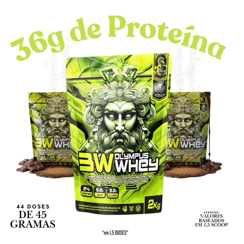 WHEY PROTEIN 3W APOLLO NUTRITION - OLYMPUS WHEY Whey 3W APOLLO NUTRITION é a proteína ideal para quem treina hipertrofia e quer ganhar massa muscular. Ideal porque é um suplemento de alto valor biológico, com grande concentração de proteínas e aminoácidos e também rico em Glutamina e BCAA Composto por três tipos de proteínas do soro do leite (Concentrada (WPC), Isolada (WPI) e Hidrolisada (WPH), suas matérias-primas possuem alta quantidade de aminoácidos, principalmente de BCAAs. BENEFÍCIOS - Aumenta o volume de massa magra. - Potencializa a recuperação do tecido muscular. - Combate a inflamação local das fibras. - Ajuda na redução de gorduras. - Cria uma sensação de saciedade. O consumo de Whey Protein 3w pós-treino estimula o aumento da massa magra e faz seus músculos crescerem. Isso acontece porque ele fornece as proteínas de alto valor biológico e os aminoácidos essenciais que são usados no processo de aumento de massa muscular e na manutenção do tecido muscular. Por essa razão, o whey protein é utilizado, principalmente, por praticantes de atividade física e atletas de alto desempenho. Quem pratica musculação precisa ingerir uma quantidade maior de proteínas, para que o músculo se desenvolva de maneira eficiente. A proteína concentrada é uma das mais indicadas para quem está focado na hipertrofia e precisa de uma boa quantidade de proteínas na dieta para suprir as necessidades do treino. Whey Protein recupera seu tecido e fibras e combate inflamações para um treino poderoso A ingestão de whey protein favorece a recuperação do tecido muscular e a recuperação das fibras, porque os nutrientes do whey são exatamente o que o tecido muscular necessita em uma situação pós-treino. O Whey Protein APOLLO ajuda na recuperação da fibra muscular depois de um treino de hipertrofia por ser um suplemento rico em aminoácidos essenciais e proteínas de alto valor biológico, que são facilmente absorvidos pelo organismo. Dessa forma, o consumo de whey é um dos principais meios para auxiliar na recuperação do tecido muscular. Além dessa vantagem, o suplemento também tem função anti-inflamatória, o que contribui para uma recuperação mais rápida. SUGESTÃO DE USO: Misture 3 colheres de sopa (30g) em 200ml de água. Consumir 2 porções por dia. Aviso legal • Idade mínima recomendada: 18 anos. • Consumir junto com alimentos para facilitar sua assimilação. • Este produto é um suplemento dietético, não um medicamento. Suplementa dietas insuficientes. Consulte o seu médico e/ou farmacêutico.