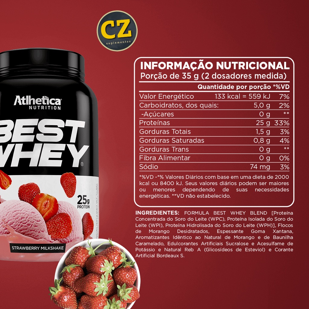 - BRIGADEIRO GOURMET - BROWNIE DE CHOCOLATE - CHOCOLATE BRANCO - CHURROS - COCO E CHOCOLATE - COOKIES CREAM - DOUBLE CHOCOLATE - DOCE DE LEITE - MOUSSE DE MARACUJÁ - MILKSHAKE DE MORANGO - ORIGINAL - ORIGINAL COM CAFÉ (CACUPPINO) - PEANUT BUTTER BEST WHEY 900G - ATLHETICA NUTRITION BEST WHEY 900G - ATLHETICA NUTRITION®: O Best Whey da Atlhética Nutrition® é sem dúvidas o Whey Protein mais querido do Brasil. Este excelente Whey Protein se destaca pelo sabor e cremosidade inigualáveis. São 21 sabores ao todo e é difícil escolher qual é o mais gostoso. A Linha Best Whey vai desde os sabores tradicionais como Morango, Baunilha e Chocolate, até sabores muito exóticos como Milho Verde, Abacaxi Frapê, Mousse de Maracujá e agora recentemente foi lançado o sabor Panetone. Todos os sabores levam uma qualidade em comum: A Cremosidade! O BEST WHEY da Atlhética Nutrition® vai muito além do que um simples Whey Protein, com este produto você consegue fazer receitas incríveis! Antes deste produto qualquer bolo proteico, brownie proteico, ou qualquer outra receita que levava Whey Protein em sua composição era muito sem "vida" e sem sabor, hoje quando se utiliza o BEST WHEY na preparação de receitas proteícas, low carb, high protein, qualquer prato fica extremamente delicioso! Best Whey já foi eleita 2x a melhor proteína nacional pela Revista Suplementação e é referência no Brasil e no exterior pela qualidade. A Atlhetica Nutrition® foi pioneira na produção de Whey Proteins com sabores variados e hoje a marca é referência para atletas e esportistas.