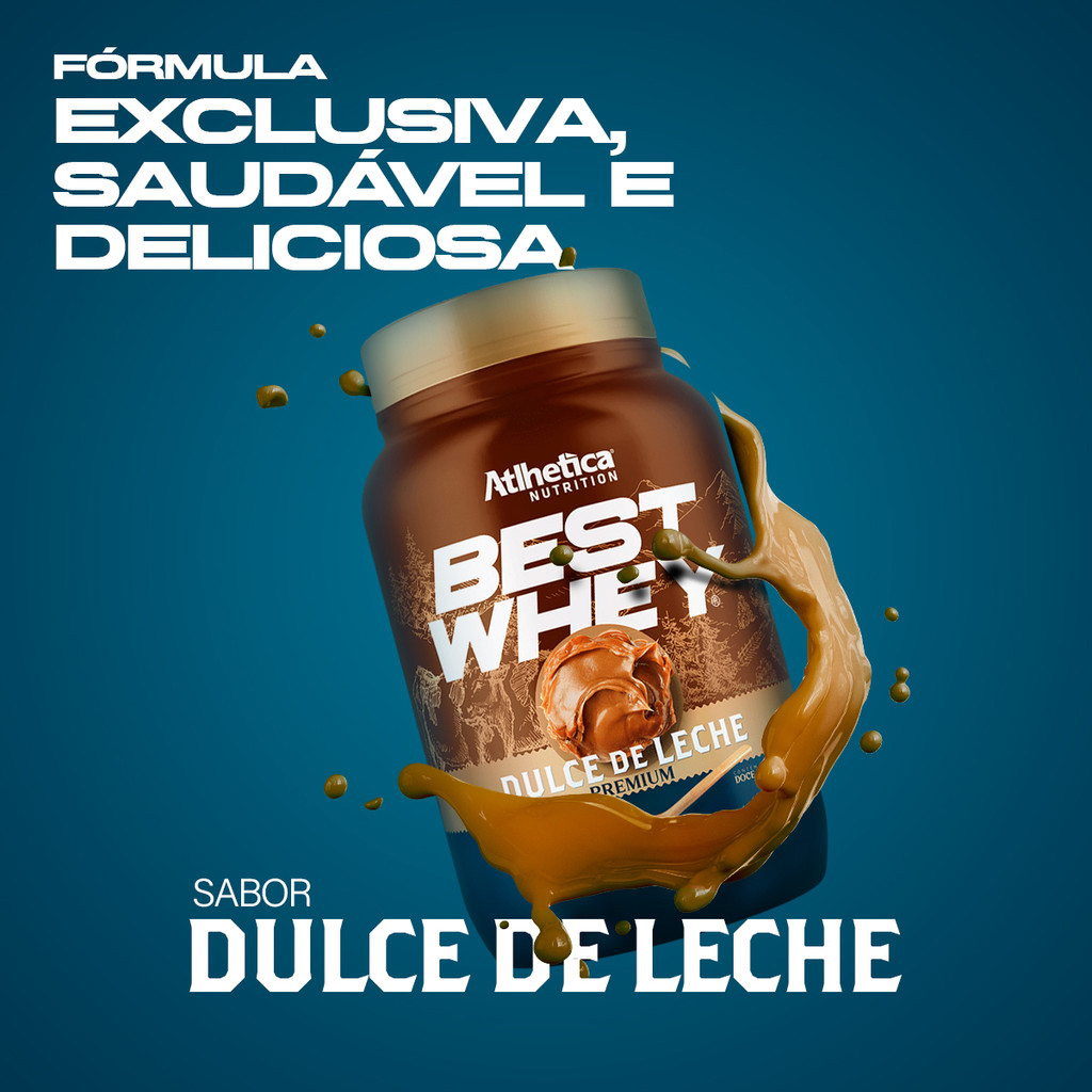 INFORMAÇÕES DE DESTAQUE 25g de proteínas por dose Sem açúcar Sem glúten Ideal para receitas DESCRIÇÃO Best Whey Protein é um suplemento formulado pela Atlhetica Nutrition para complementar a ingestão proteica diária, seja para o dia a dia ou para os treinos. Com 25g de proteína de alto valor biológico por dose, essa fórmula exclusiva combina proteínas WPC, WPI e WPH. É uma opção saudável e saborosa para quem busca qualidade nutricional com praticidade. Seu perfil proteico é ideal para diversas receitas e pode ser adicionado à bebida de sua preferência. INGREDIENTES Proteínas de alto valor biológico, blend de proteínas WPC (concentrada), WPI (isolada) e WPH (hidrolisada), doce de leite real em sua composição. Não contém glúten SUGESTÃO DE USO Para adultos saudáveis (a partir de 19 anos), misture 2 dosadores medida (35g) de Best Whey® em 200ml de água ou outra bebida de sua preferência. Pode ser consumido antes ou após os treinos, conforme recomendação de um profissional de saúde.